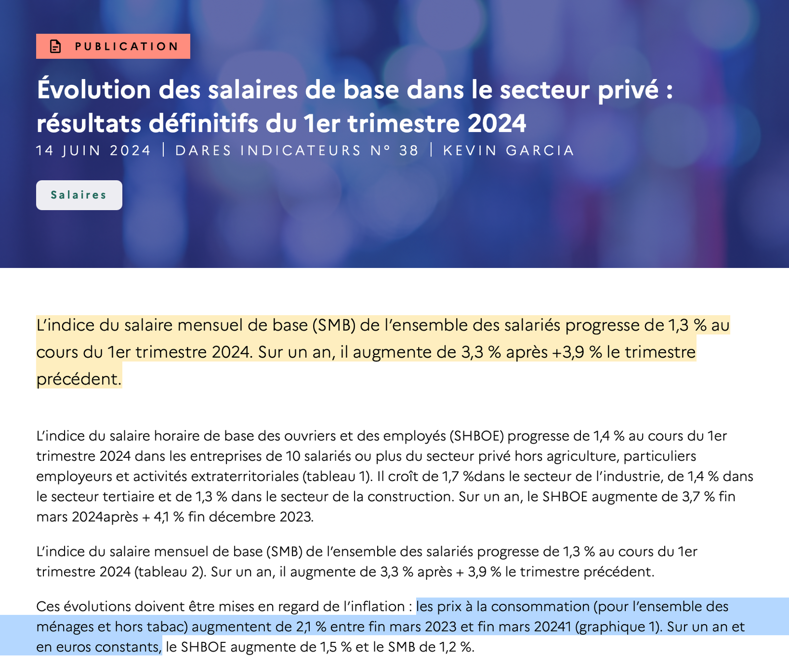 La Dares, service statistique ministériel du Ministère du Travail, publie des évolutions de salaires dites “en euros constants” en utilisant comme indice de prix l’IPC hors tabac, ce qui est problématique par rapport à ces recommandations internationales…