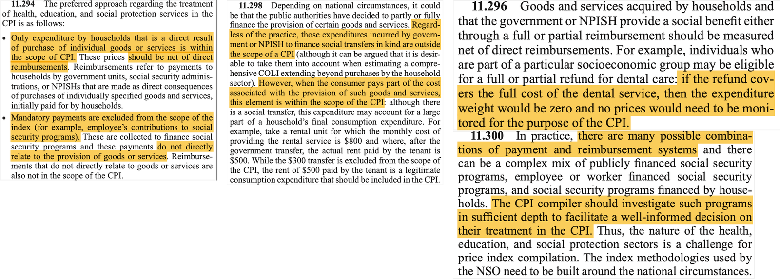 Le manuel CPI (Banque Mondiale et al. 2020) dit très clairement: “Seules les dépenses directes des ménages, nettes des remboursements, doivent être incluses.”