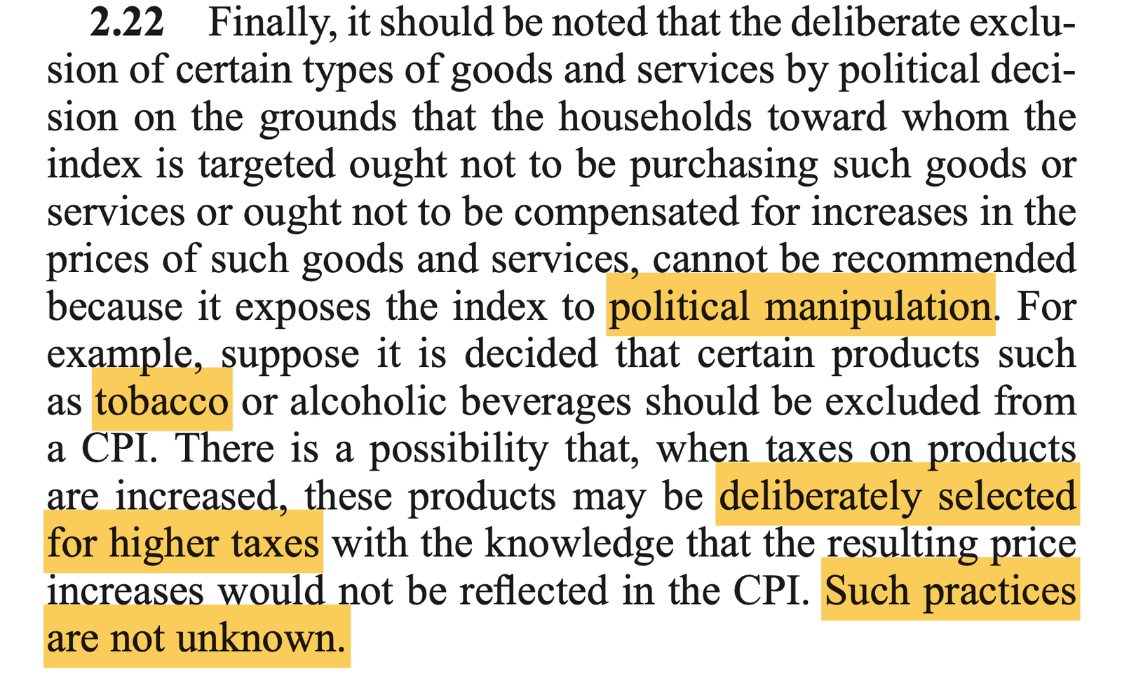 L’« IPC hors tabac » utilisé pour certaines indexations (Smic, prestations, loyers) ne respecte pas les recommandations internationales, qui déconseillent d’exclure des biens (y compris tabac et alcool) pour éviter des manipulations politiques.
