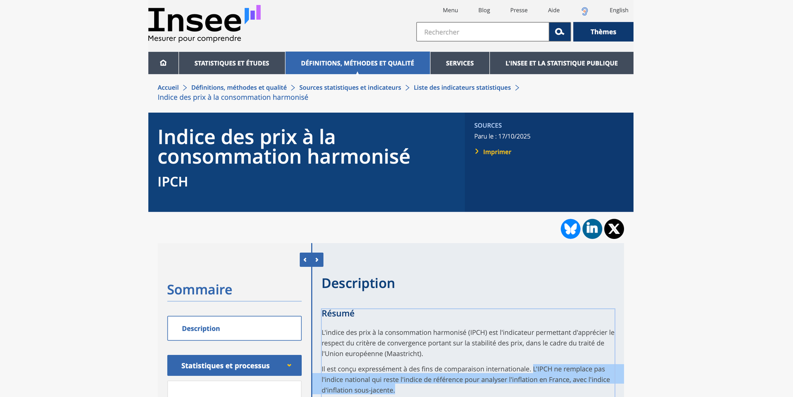Selon l’Insee, « L’IPCH ne remplace pas l’indice national qui reste l’indice de référence pour analyser l’inflation en France. » Voir en ligne.