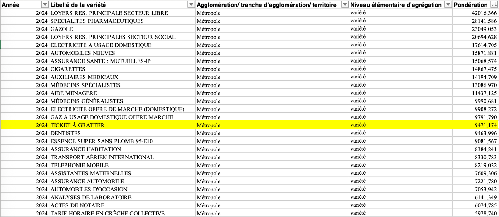 Dans l’IPC existe un poste jeux de hasard, représenté par la variété “Ticket à gratter” pour 1% de l’indice !! => minimisation de l’inflation. Non mentionné dans le Blog de l’Insee le 1er mars 2022.