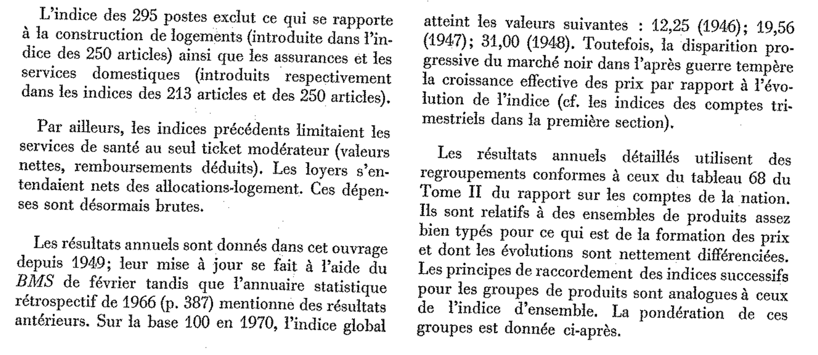 Avant 1971 : suivi des prix nets. Depuis 1971, 5ème génération de l’indice des prix (indice des 295 postes, base 1970) : suivi des prix bruts (base 1970).