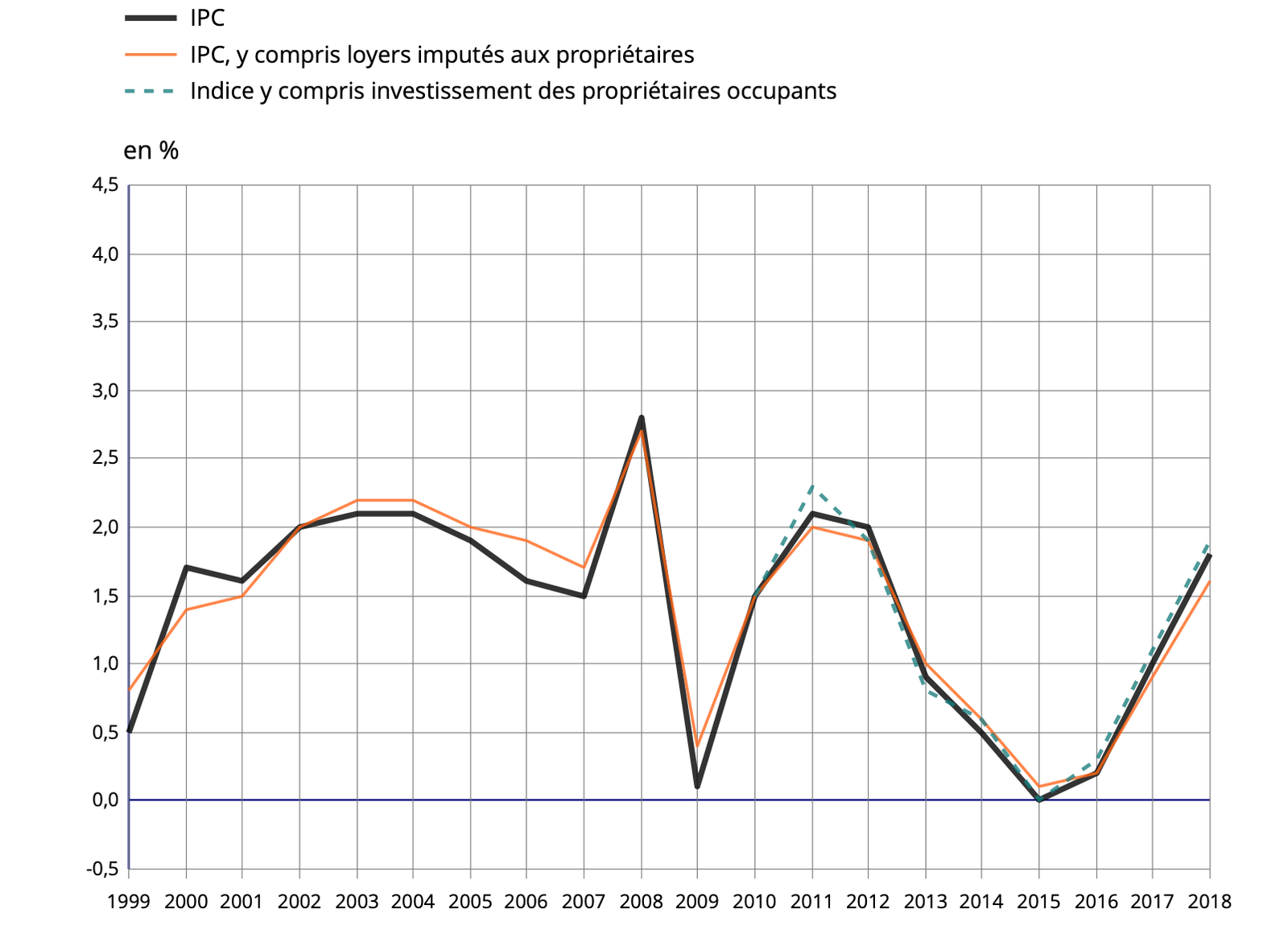 mais cela relève d’une harmonisation minimale (à cause de la France ?), non d’un consensus scientifique. Par ailleurs, inclure le logement des propriétaires est fixé comme un objectif depuis au moins 2000 par la BCE. Voir en ligne.L’IPCH se contente plus facilement d’un indicateur de dépenses monétaires, car il est utilisé à des fins de politique monétaire (BCE), tandis que l’IPC national sert à indexer salaires et prestations sociales.