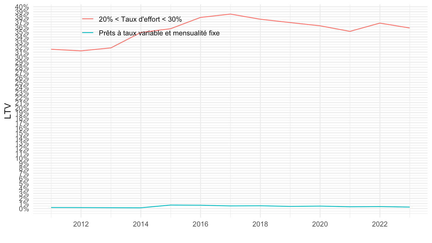 xlab("") + ylab("Prêts à taux fixe (encours), produits à taux fixe (production)") + theme_minimal() +