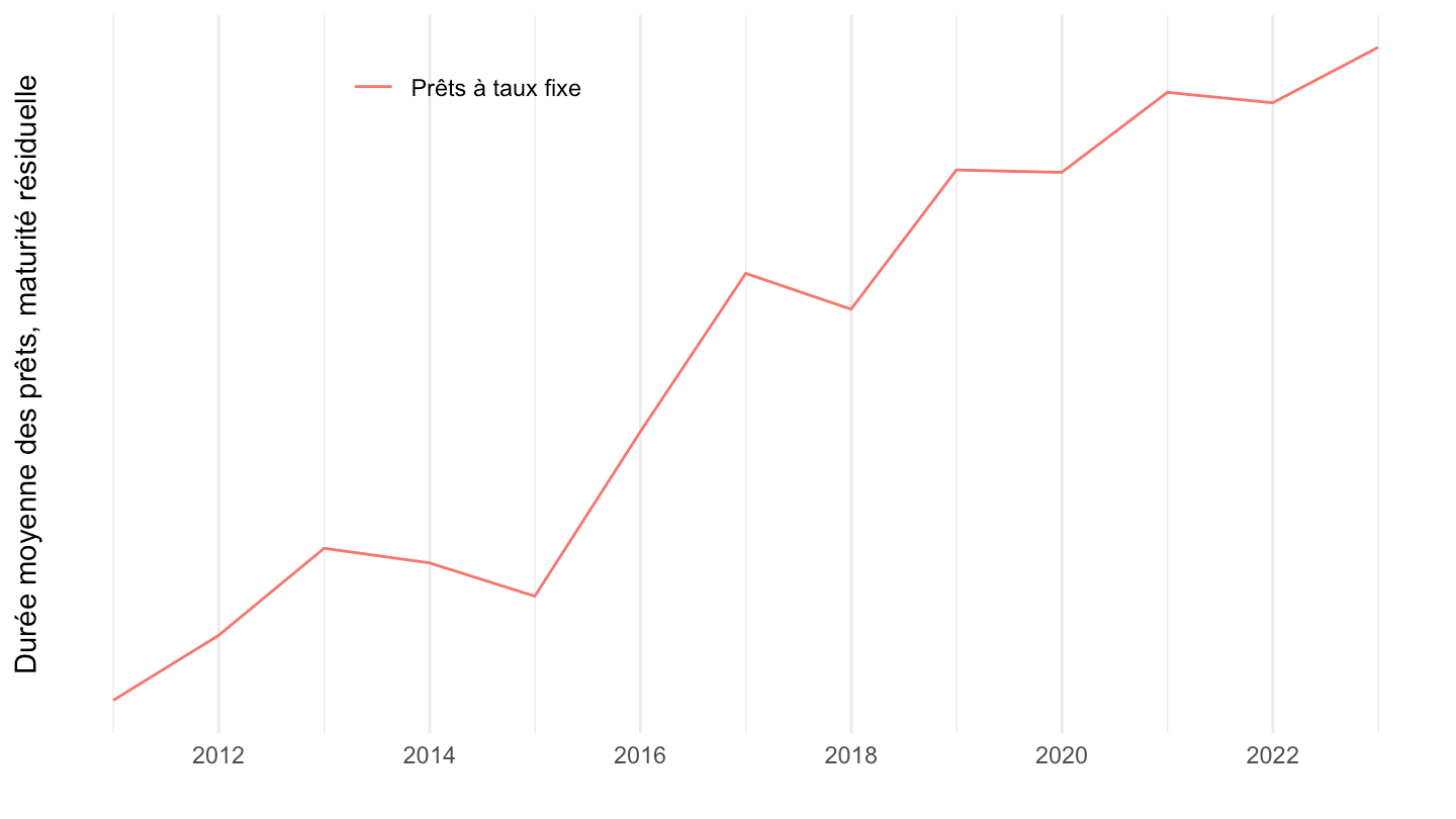 xlab("") + ylab("Durée moyenne des prêts, maturité résiduelle") + theme_minimal() +