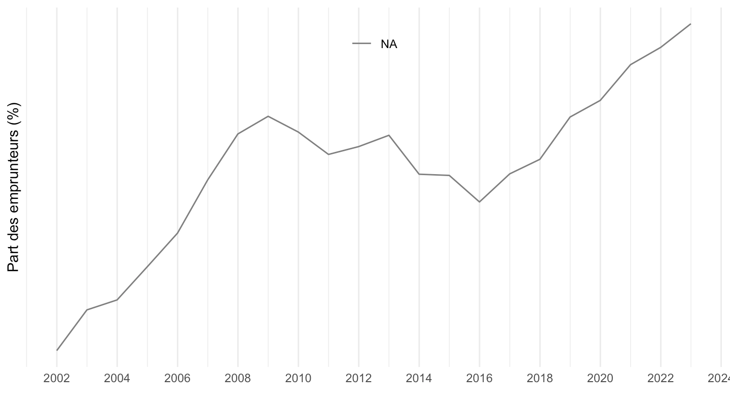 theme_minimal() + xlab("") + ylab("Part des emprunteurs (%)") +