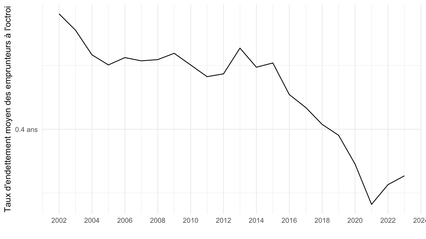 xlab("") + ylab("Taux d'endettement moyen des emprunteurs à l'octroi") + theme_minimal() +