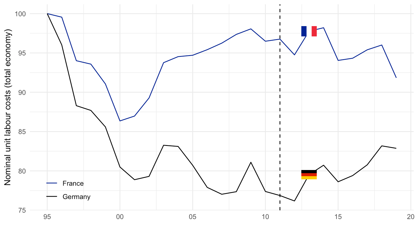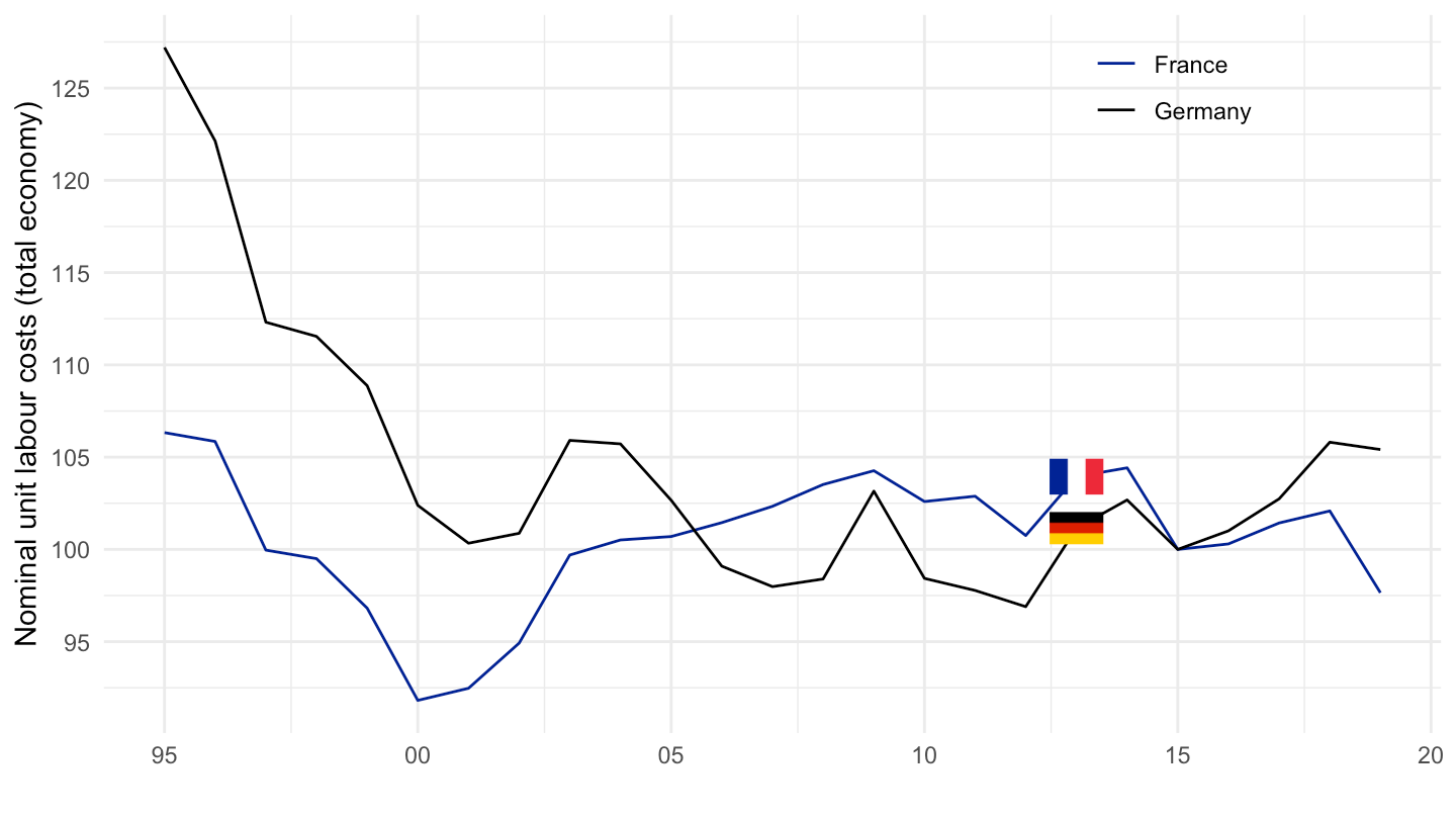 ggplot() + ylab("Nominal unit labour costs (total economy)") + xlab("") + theme_minimal() +