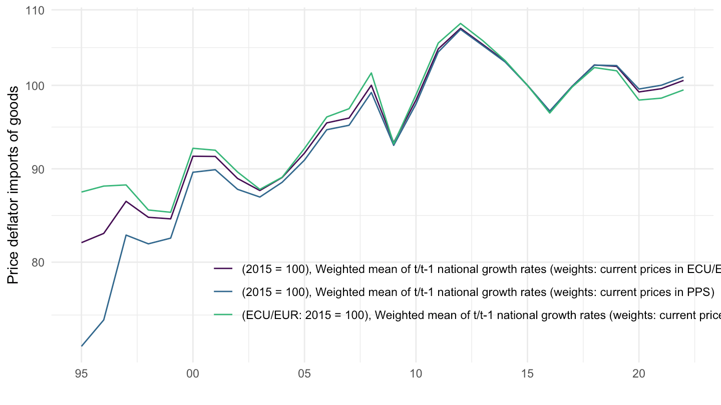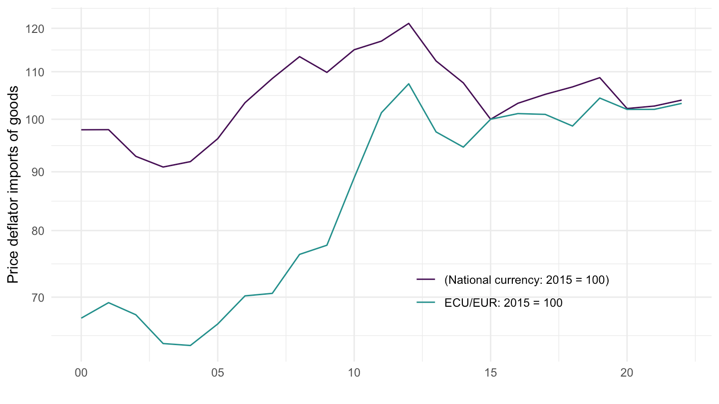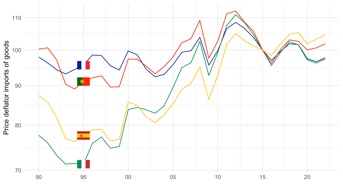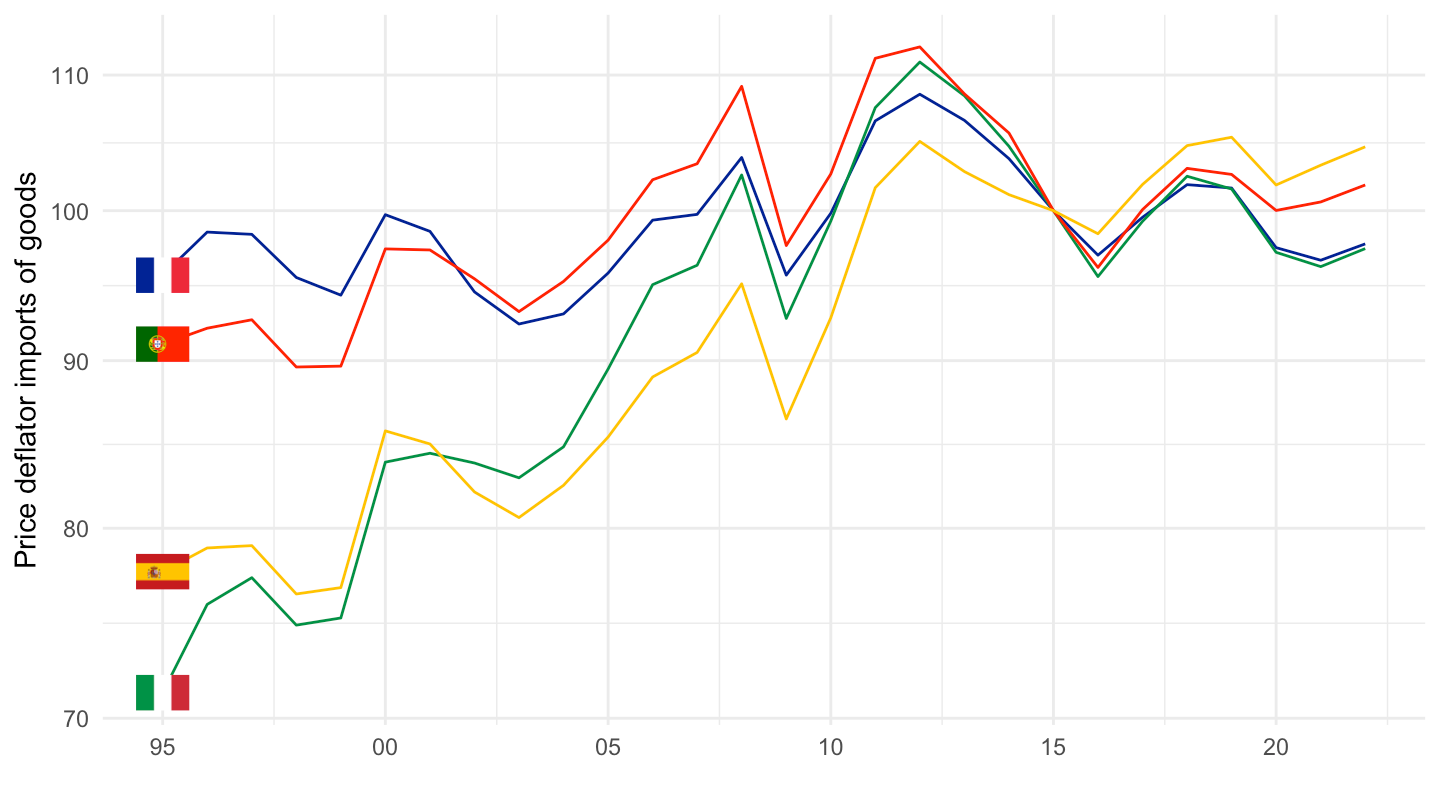 ggplot() + theme_minimal() + ylab("Price deflator imports of goods") + xlab("") +