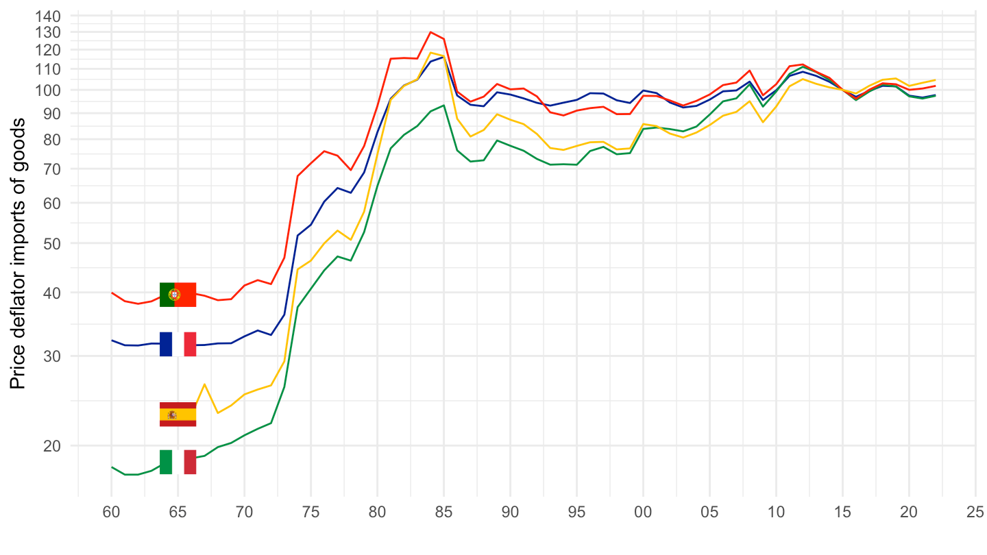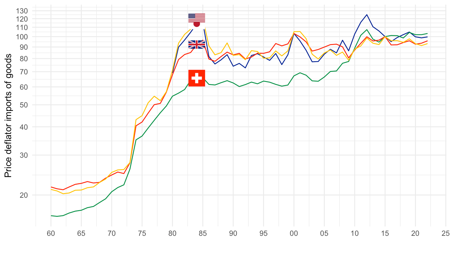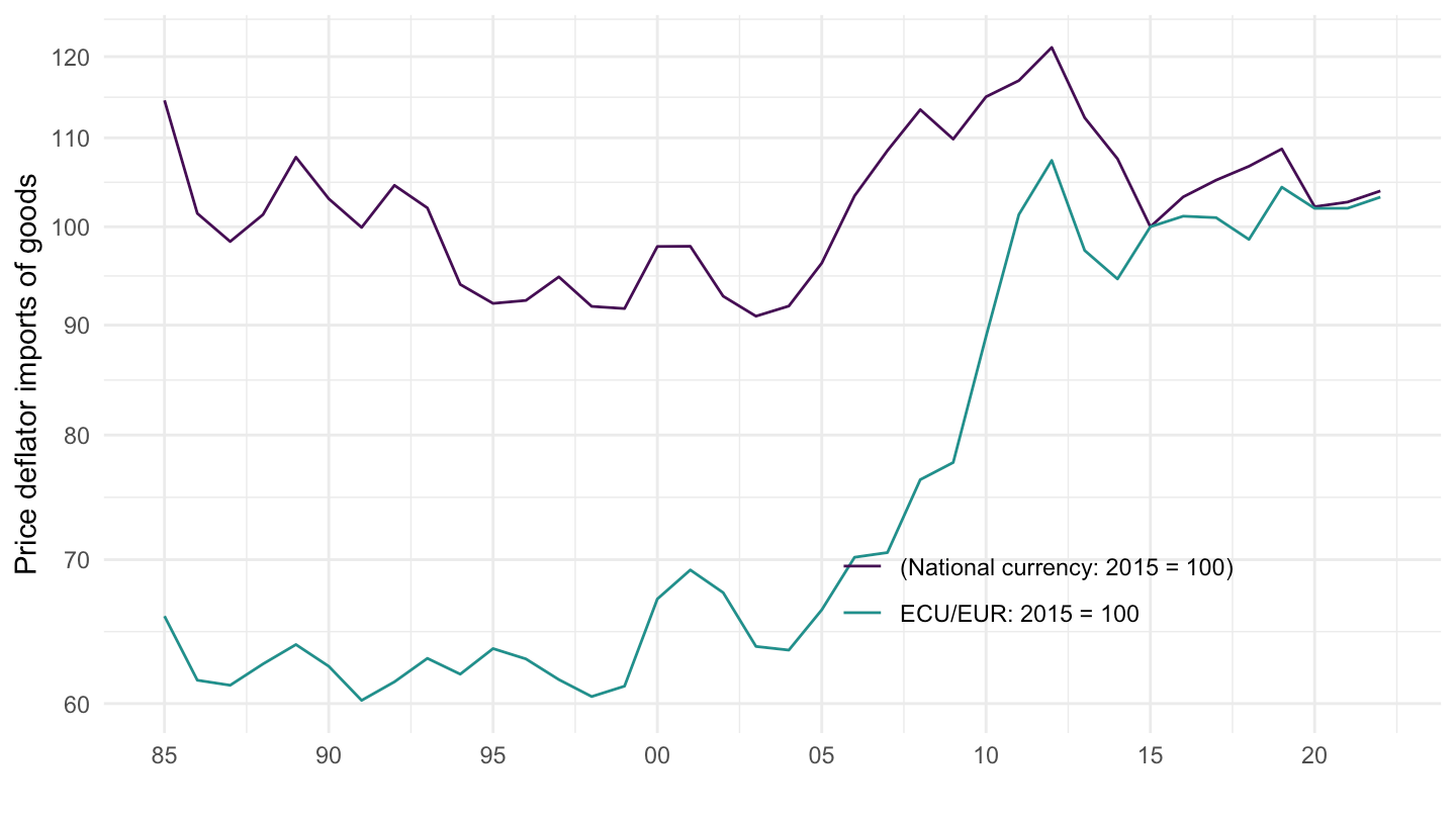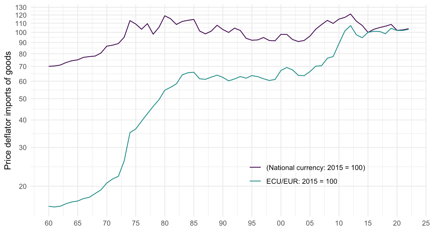 ggplot() + theme_minimal() + ylab("Price deflator imports of goods") + xlab("") +