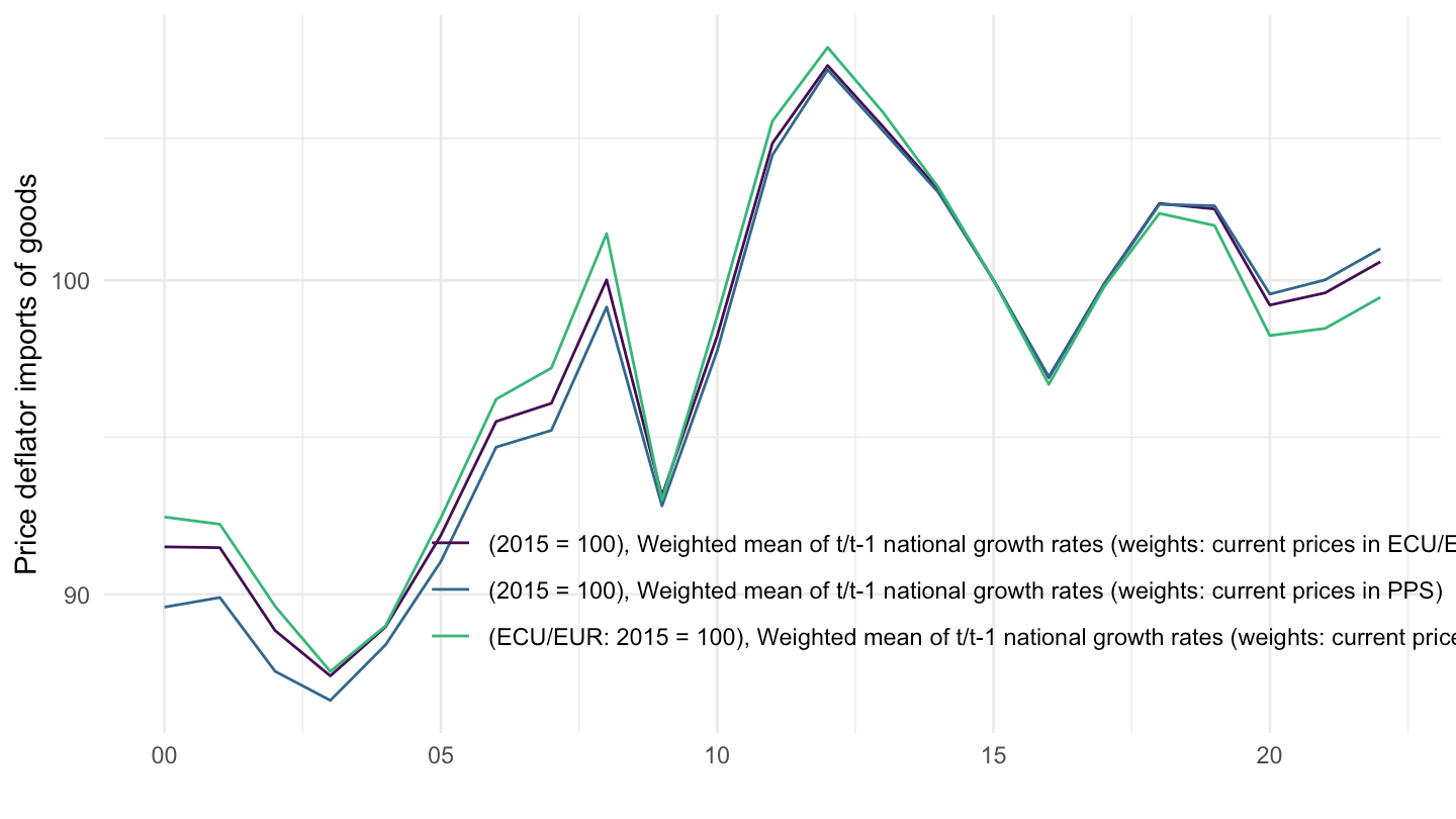 period ggplot() + theme_minimal() + ylab("Price deflator imports of goods") + xlab("") +