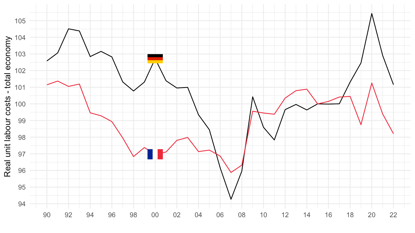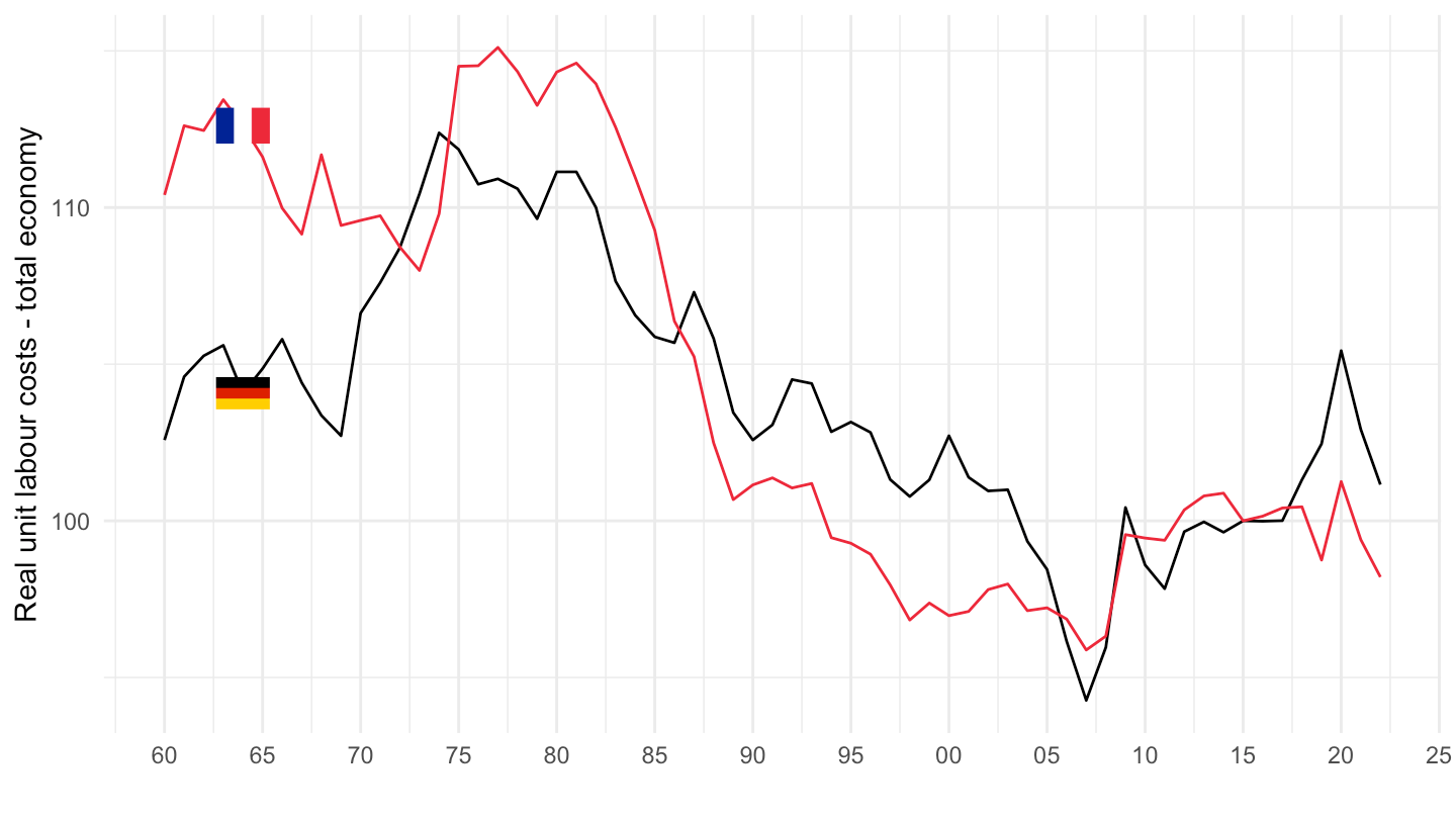 ggplot() + ylab("Coûts unitaires du travail, nominal (secteur manuf.)") + xlab("") + theme_minimal() +