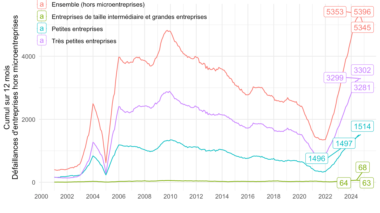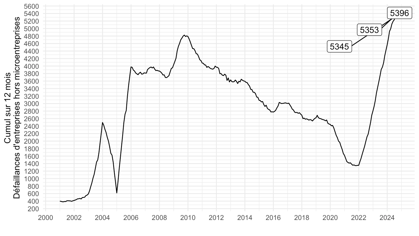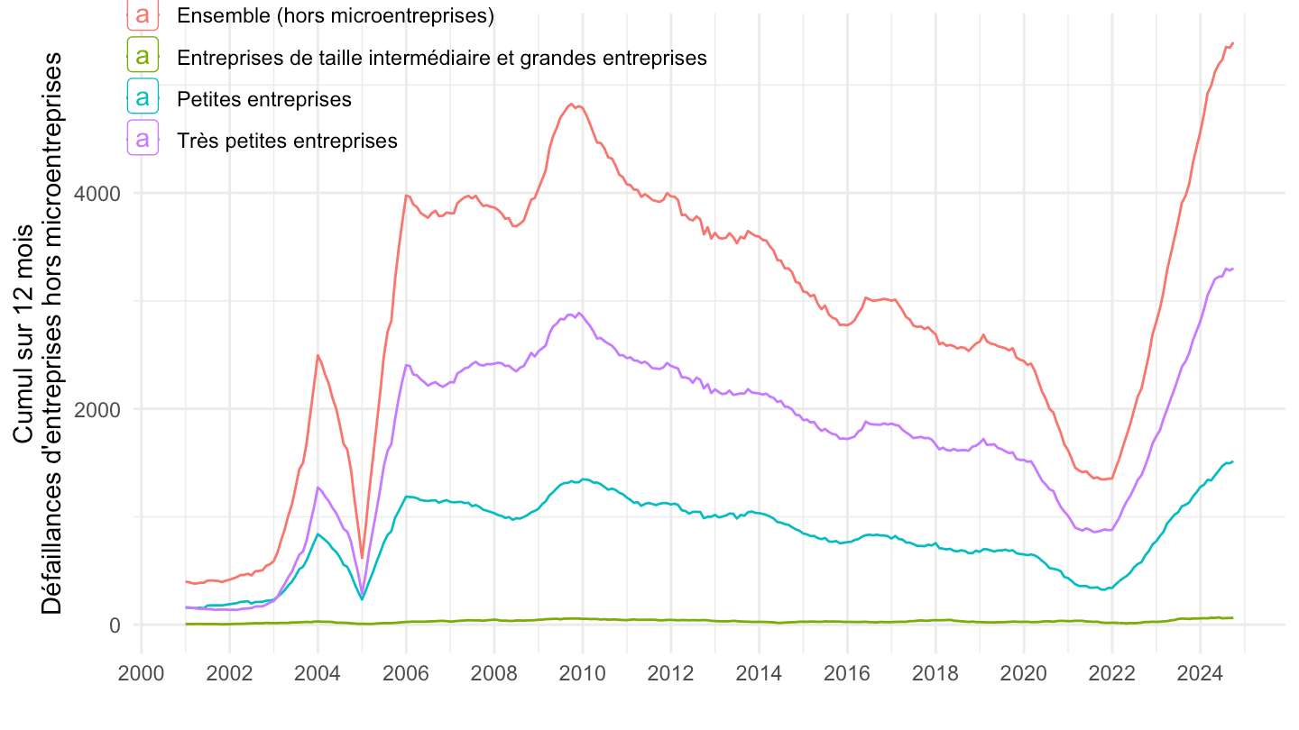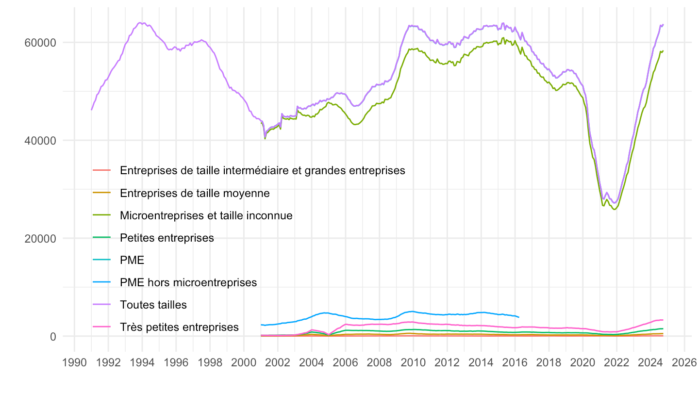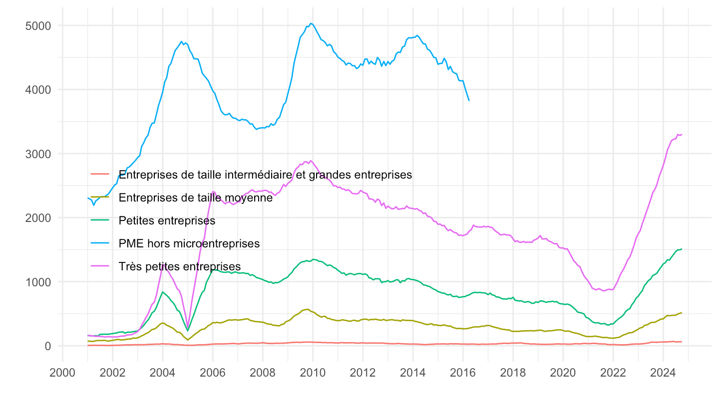 ggplot theme_minimal() + xlab("") + ylab("Cumul sur 12 mois\nDéfaillances d'entreprises hors microentreprises") +