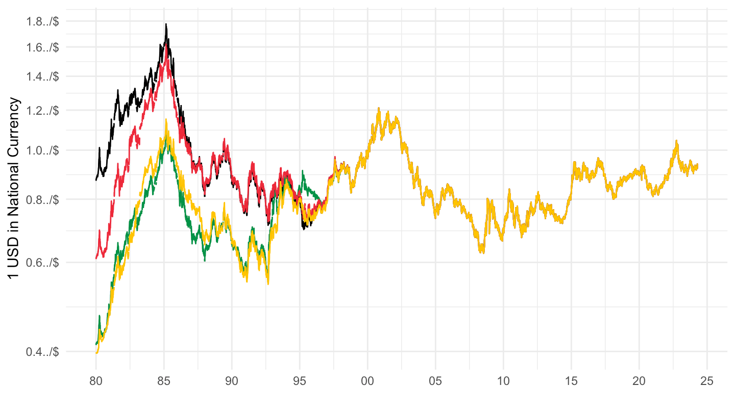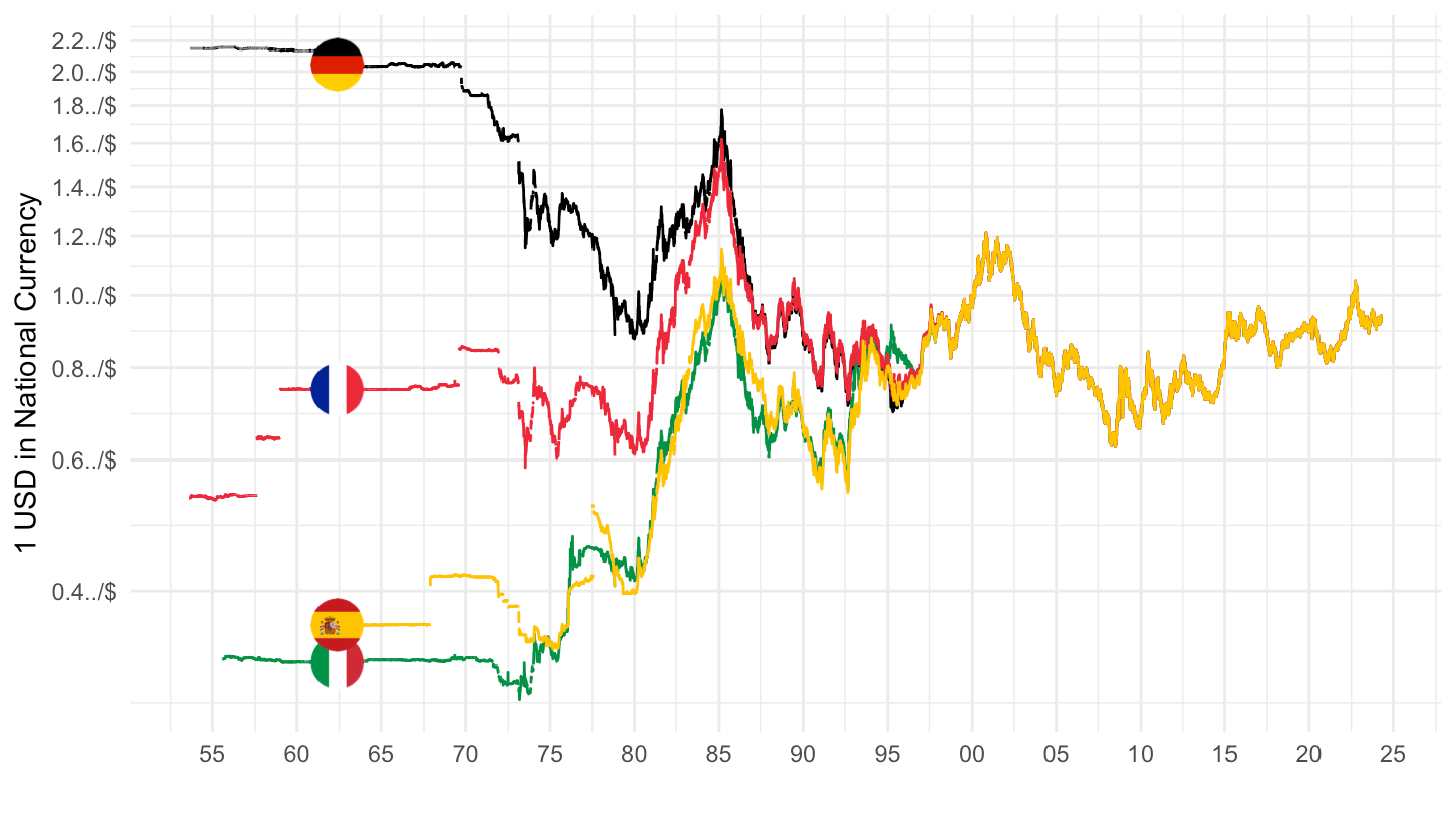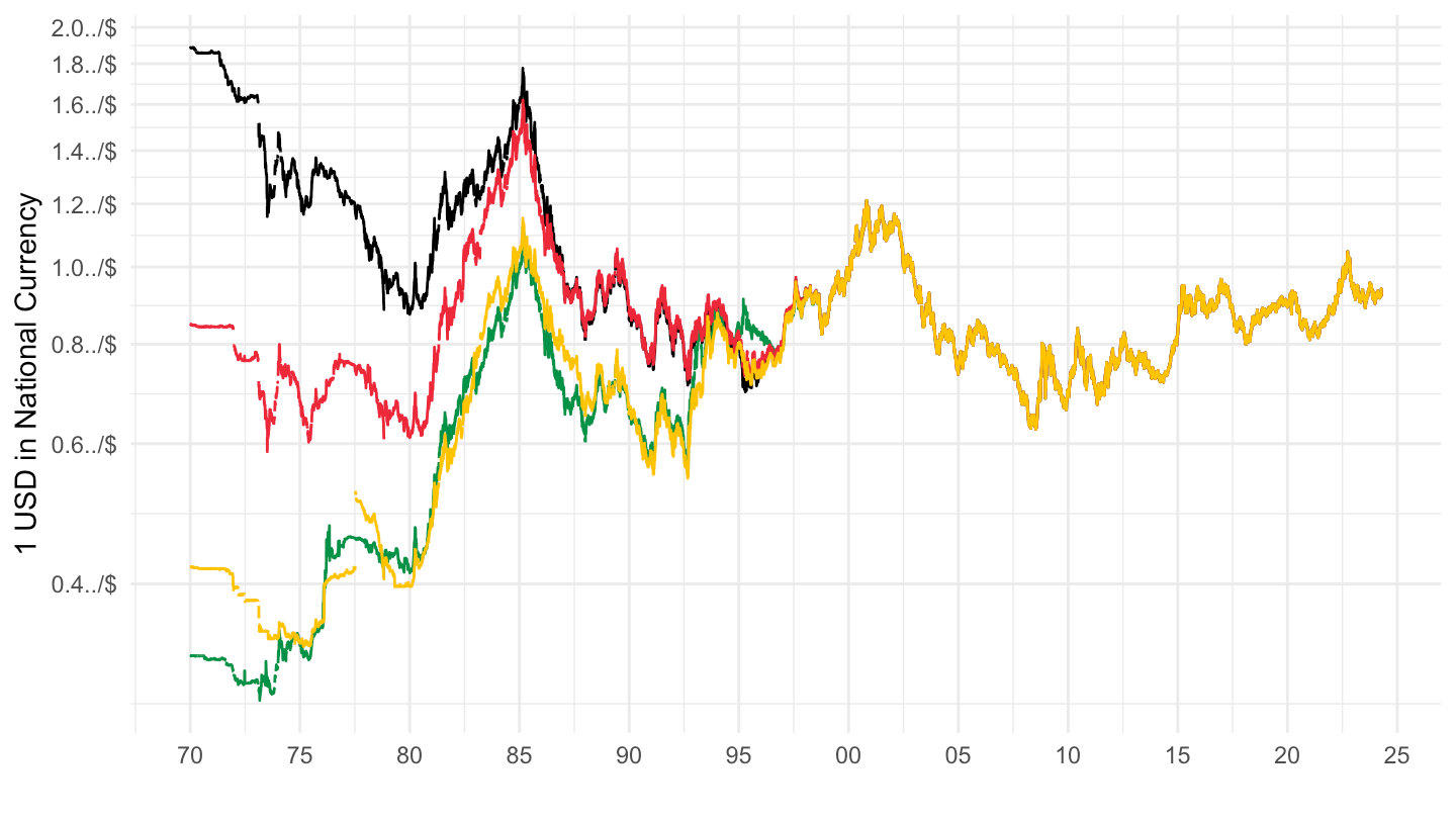 theme_minimal() + xlab("") + ylab("1 USD in National Currency") +