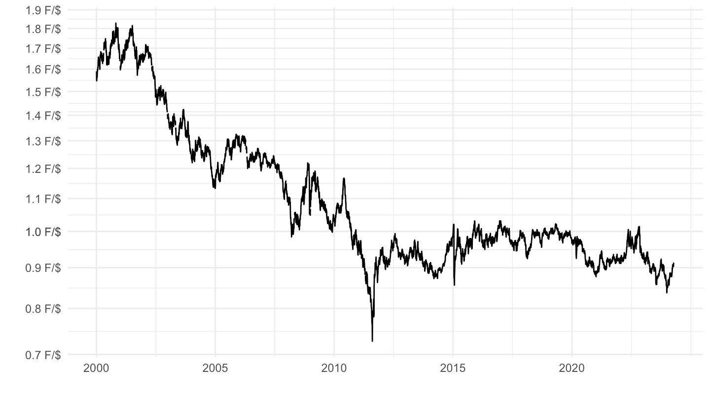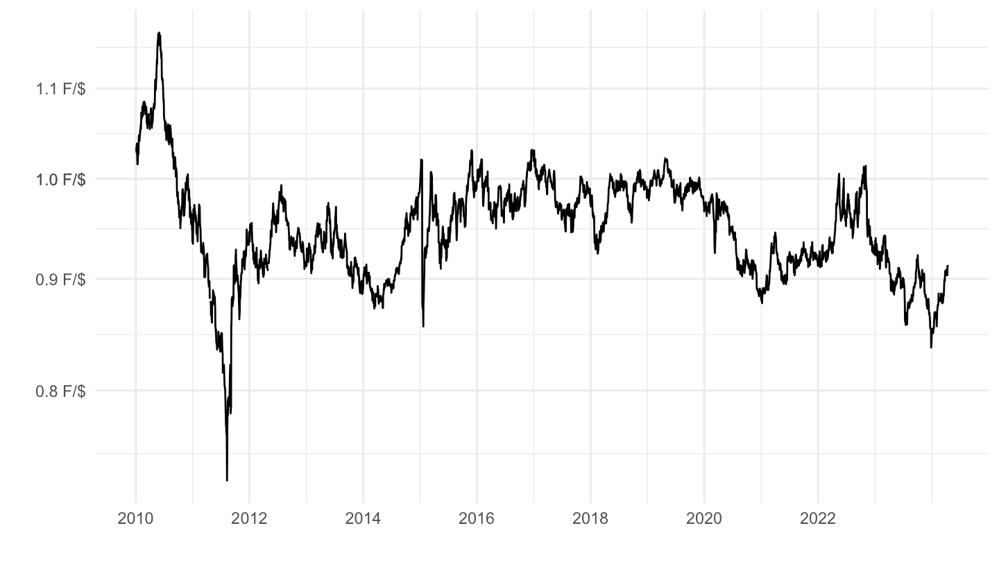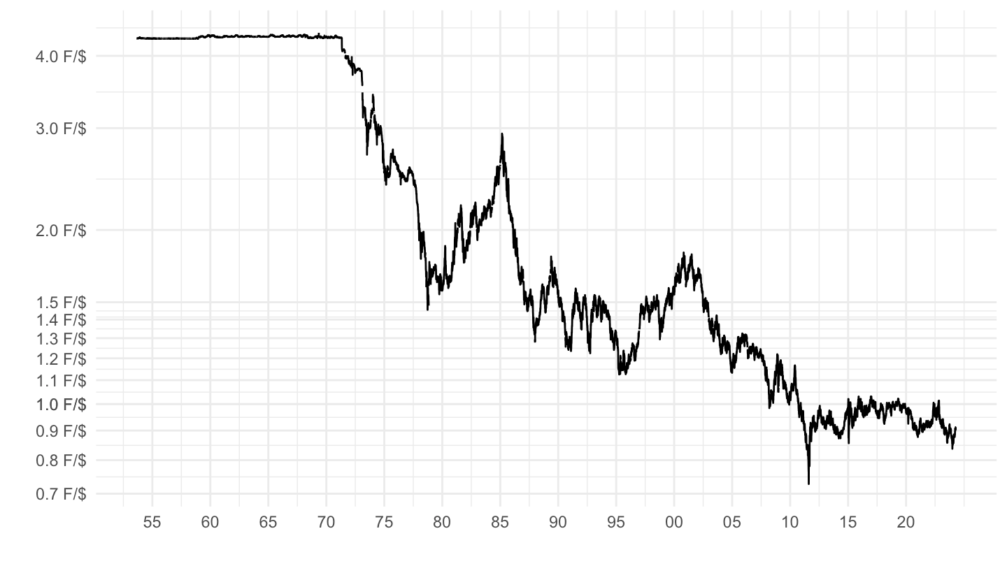 theme_minimal() + xlab("") + ylab("1 USD in National Currency") +