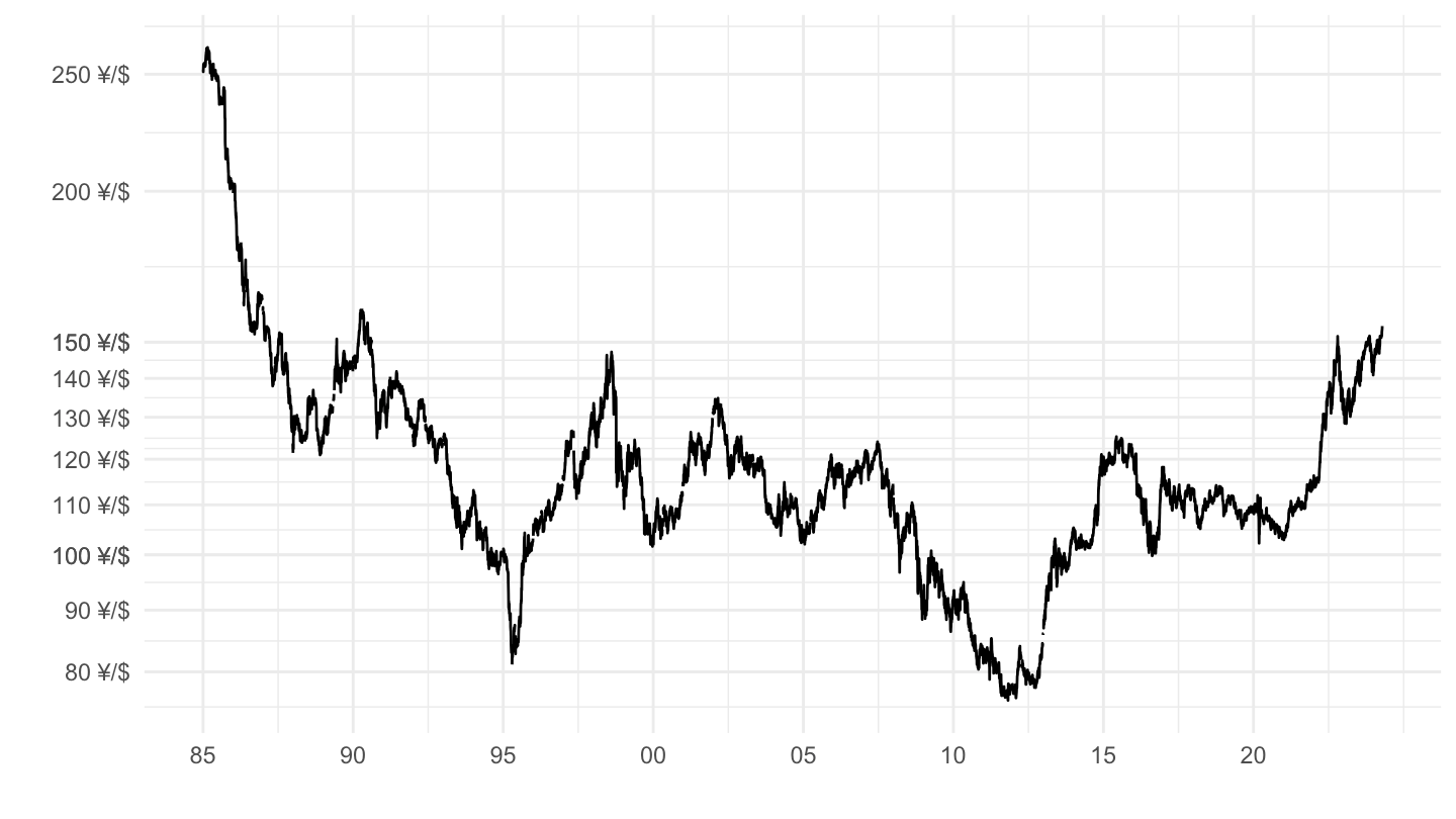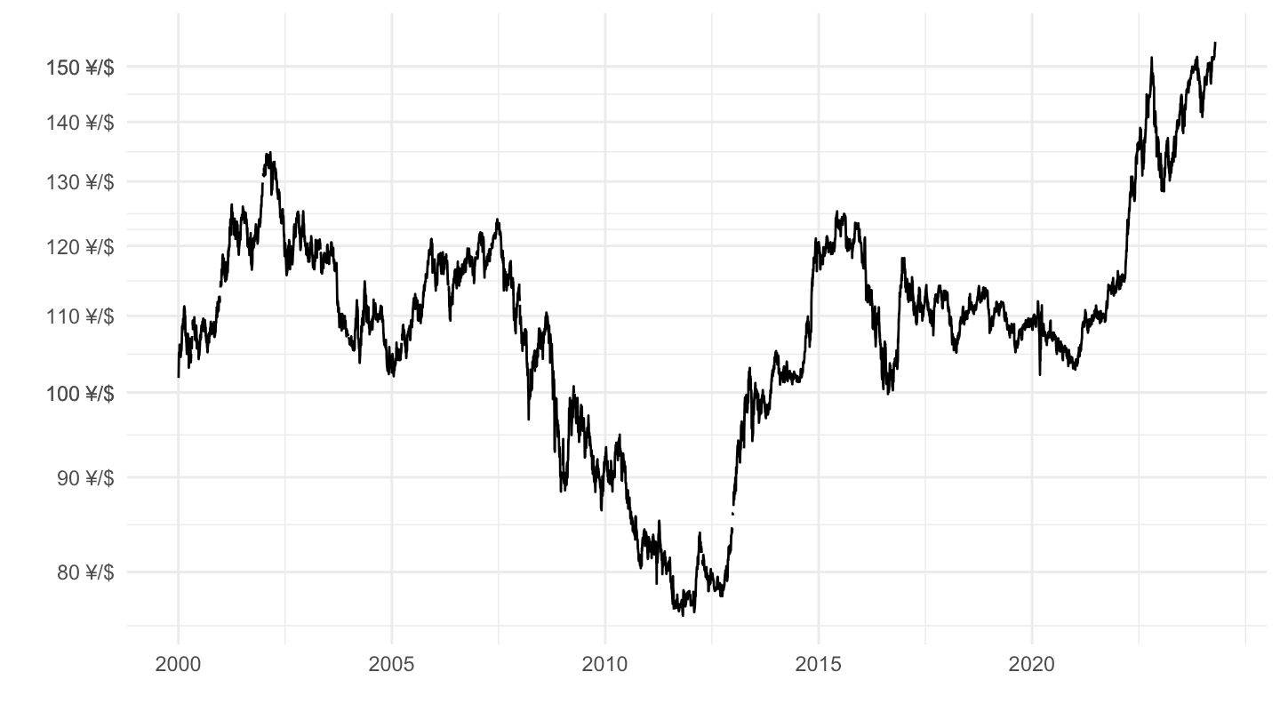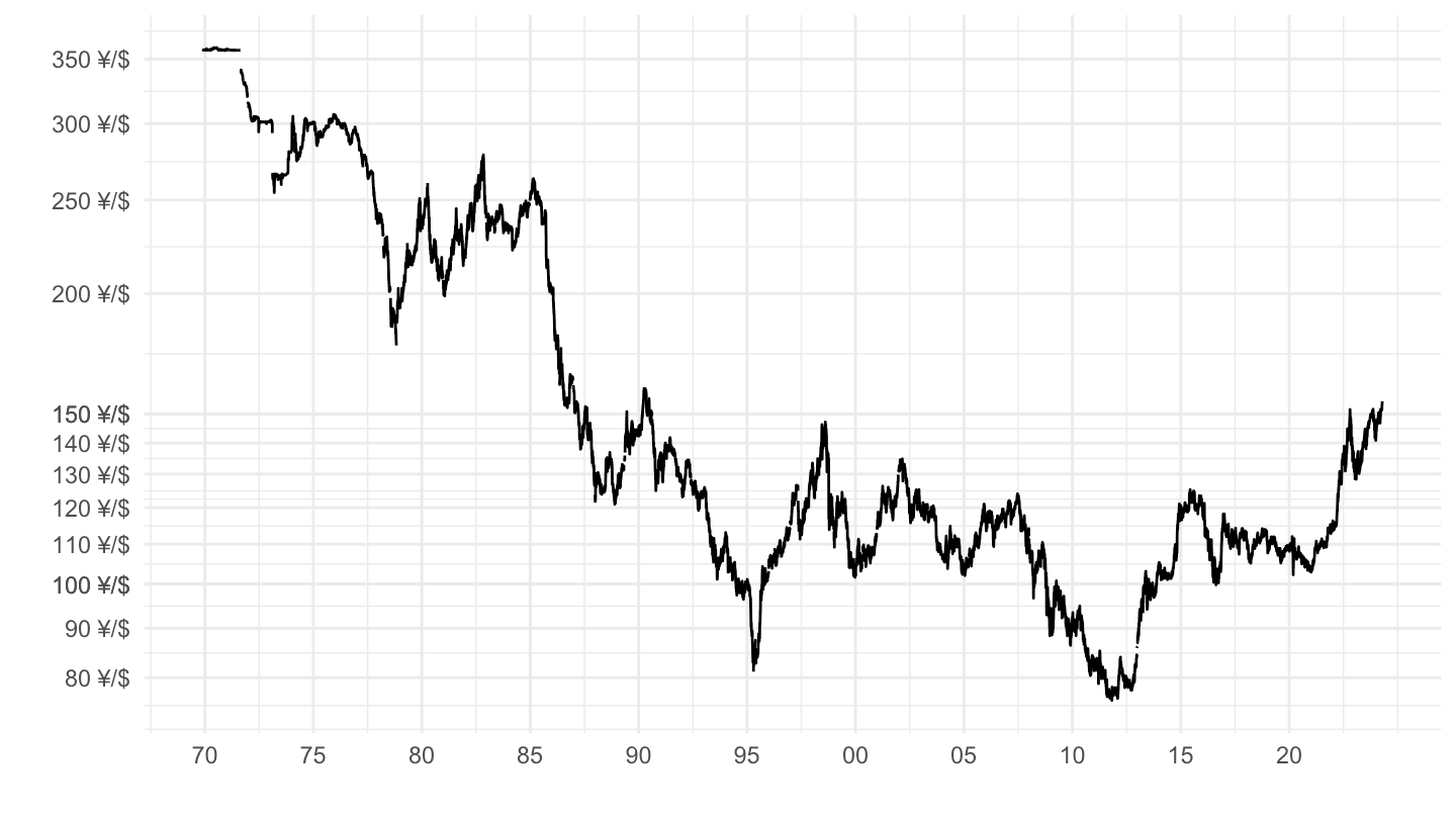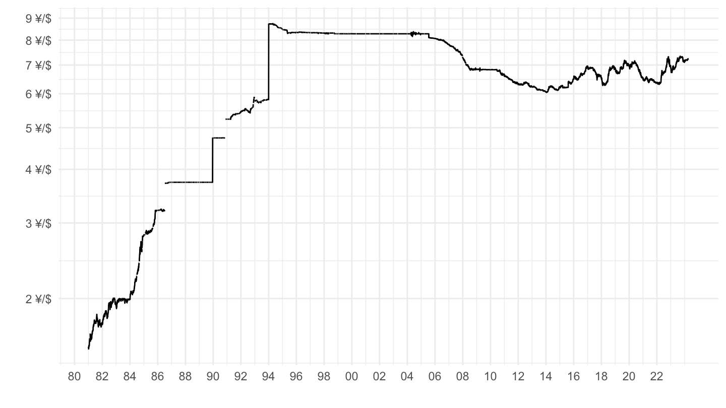labels = dollar_format(a = 1, p = "", su = " ¥/$"))