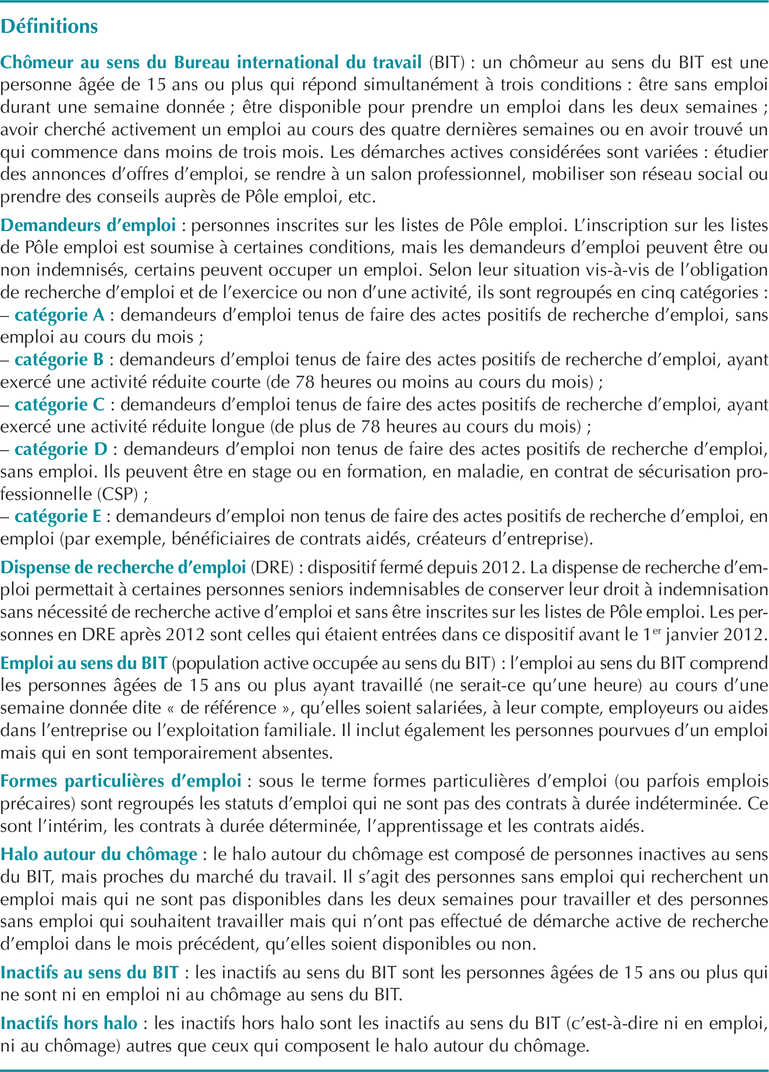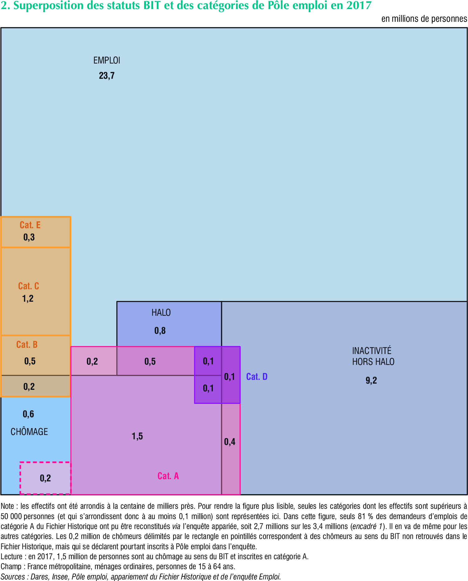 Les critères définissant les chômeurs au sens du BIT et les demandeurs d’emploi en catégorie A semblent a priori proches. Toutefois, les deux populations ne se recouvrent pas totalement, comme l’a montré en détail une étude récente de l’Insee. Environ un chômeur au sens du BIT sur cinq se déclare comme étant non inscrit à Pôle emploi (par exemple, des jeunes qui ne s’inscrivent pas car ils ne peuvent prétendre à une indemnisation). À l’inverse, deux demandeurs d’emploi en catégorie A sur cinq ne sont pas classés comme chômeurs au sens du BIT. C’est par exemple le cas des personnes qui n’ont effectué aucune démarche active de recherche d’emploi, au-delà du seul renouvellement de leur inscription à Pôle emploi.