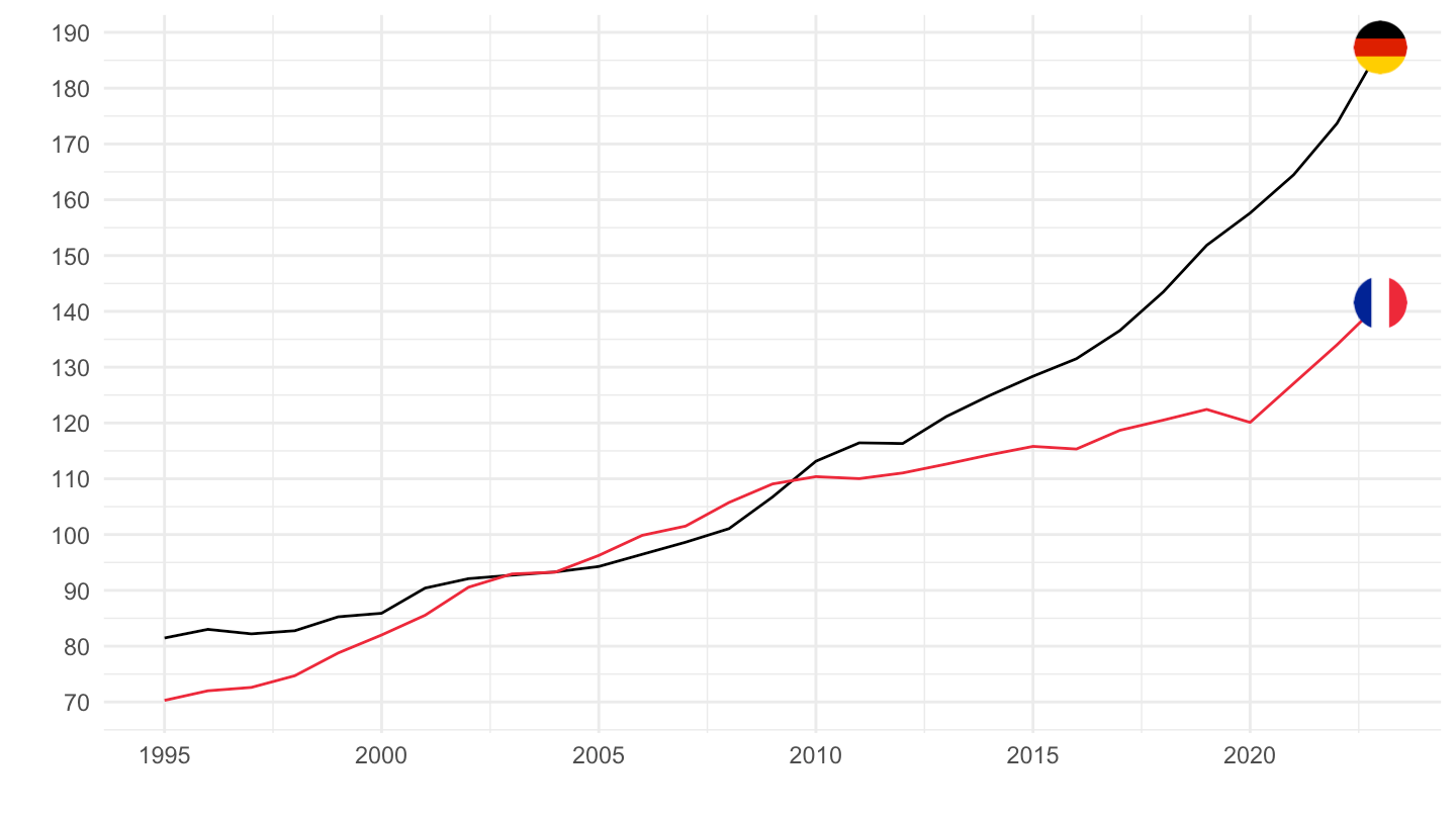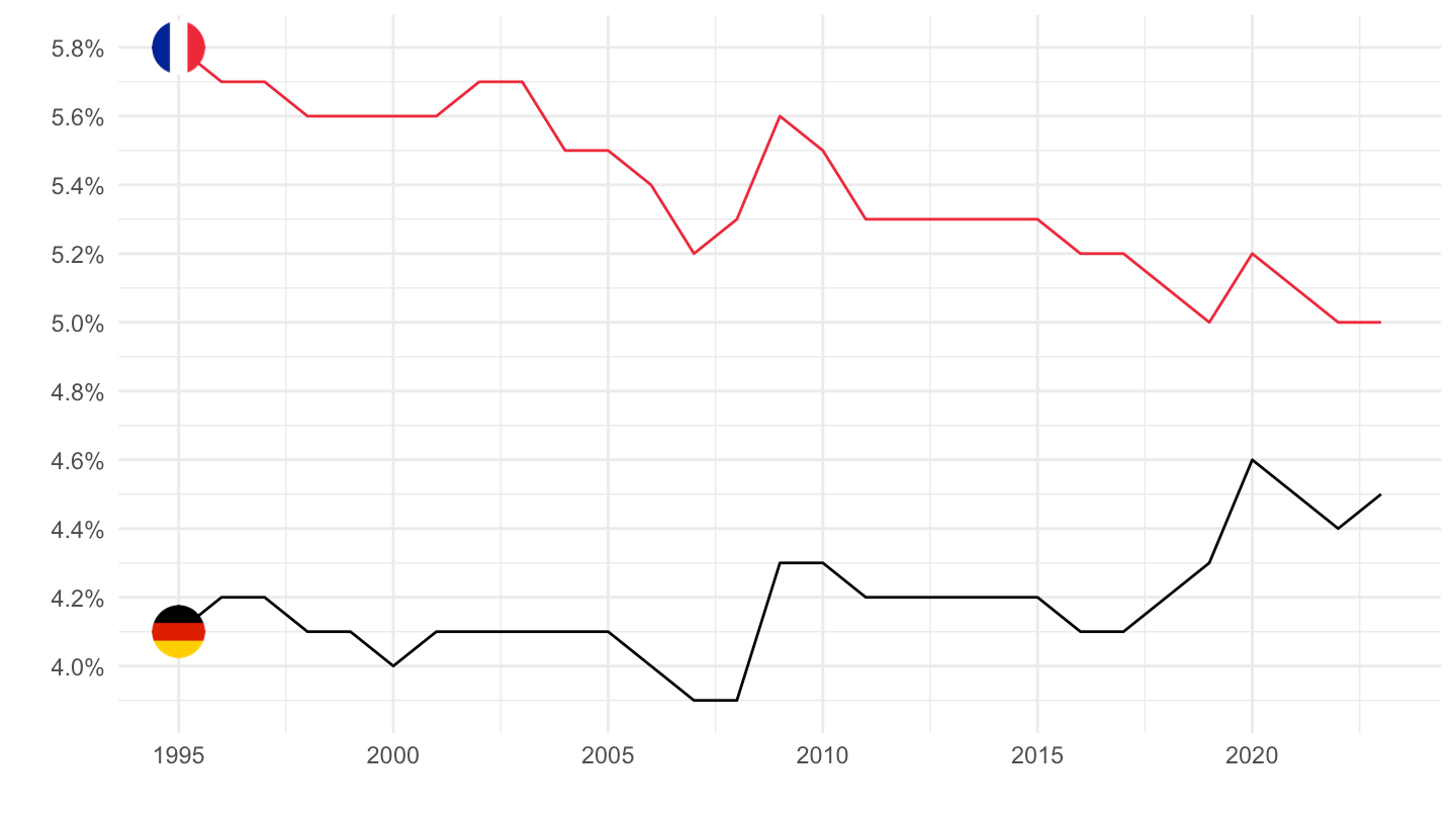 gov_10a_exp filter(geo %in% c("FR", "DE"),