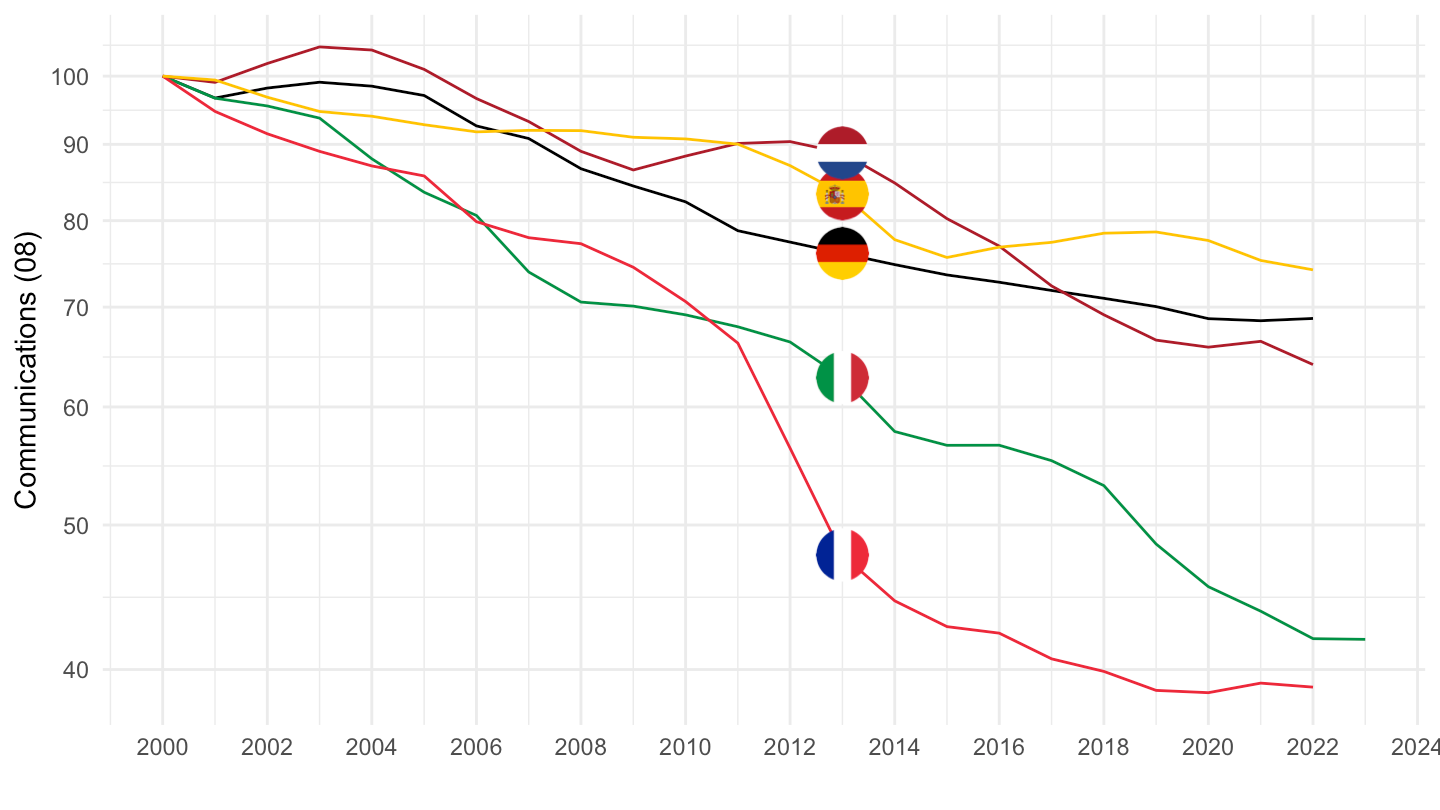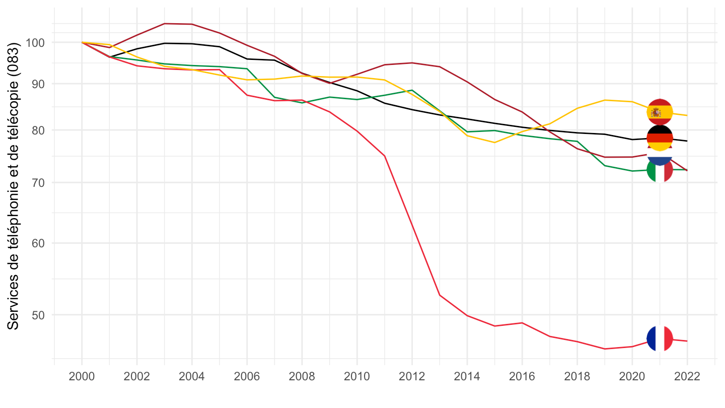 scale_color_identity() + xlab("") + ylab("Telephone and telefax services (% of Cons.)") +