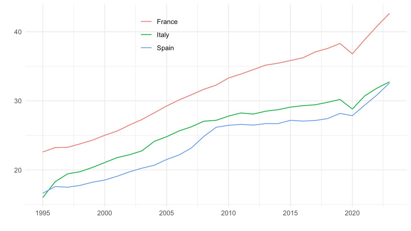 nama_10_fte filter(geo %in% c("FR", "IT", "ES"),