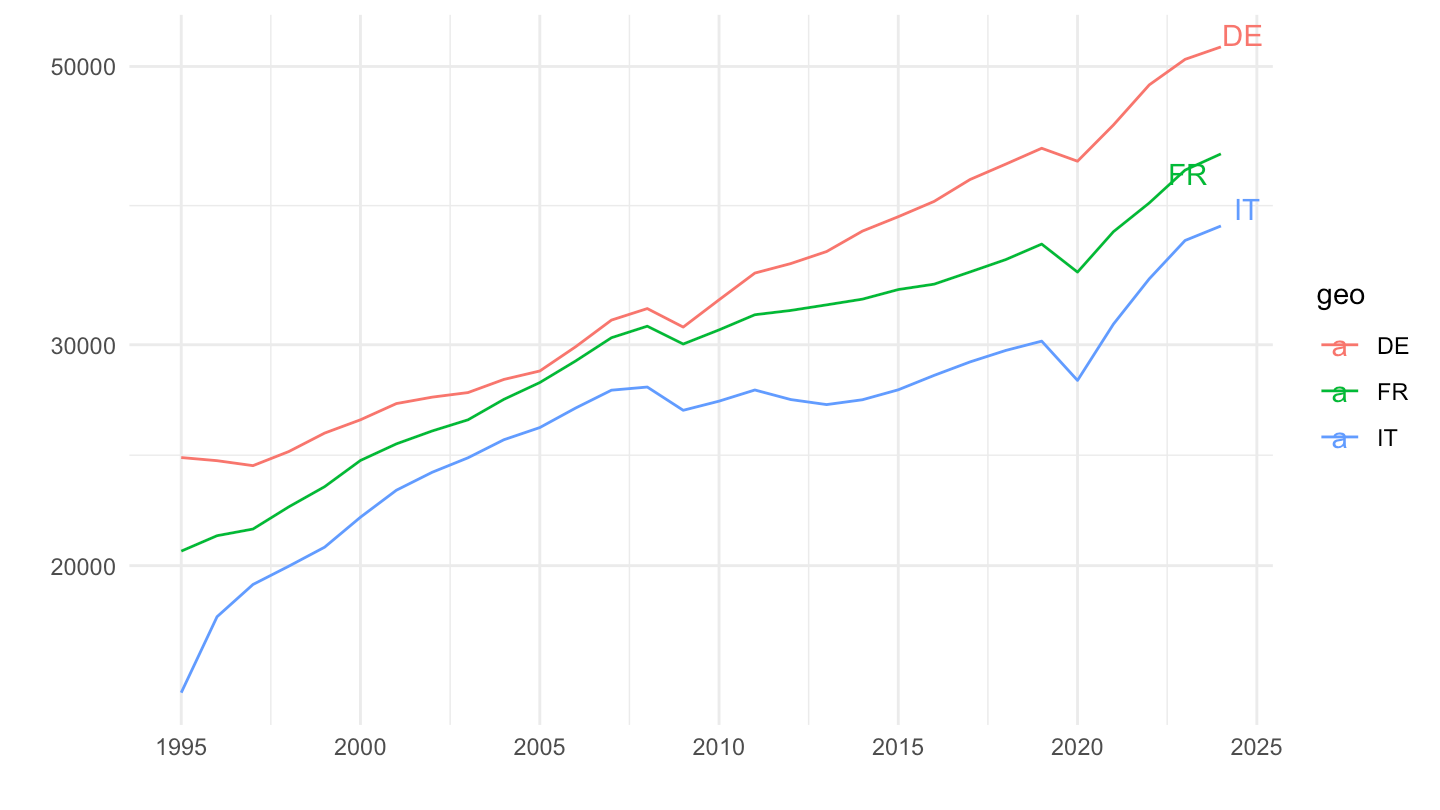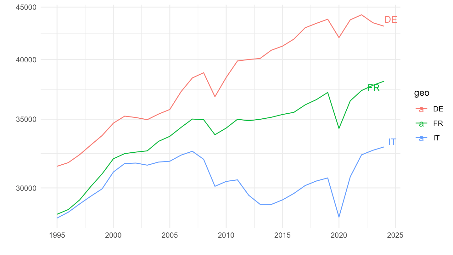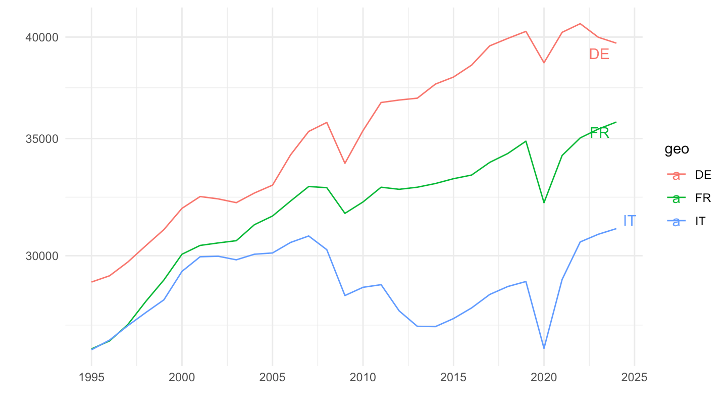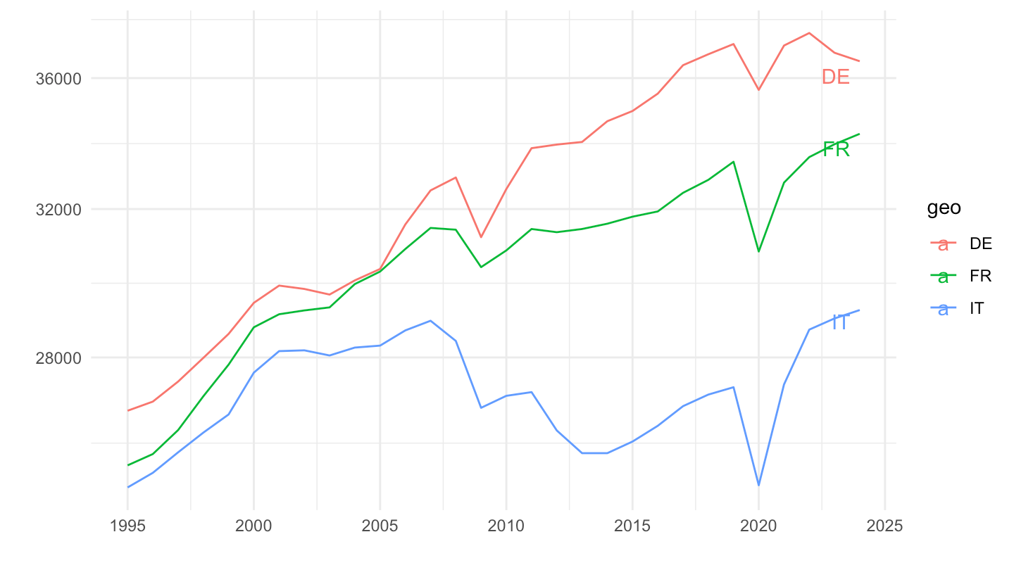 aes(x = date, y = values, color = geo, label = geo)) +