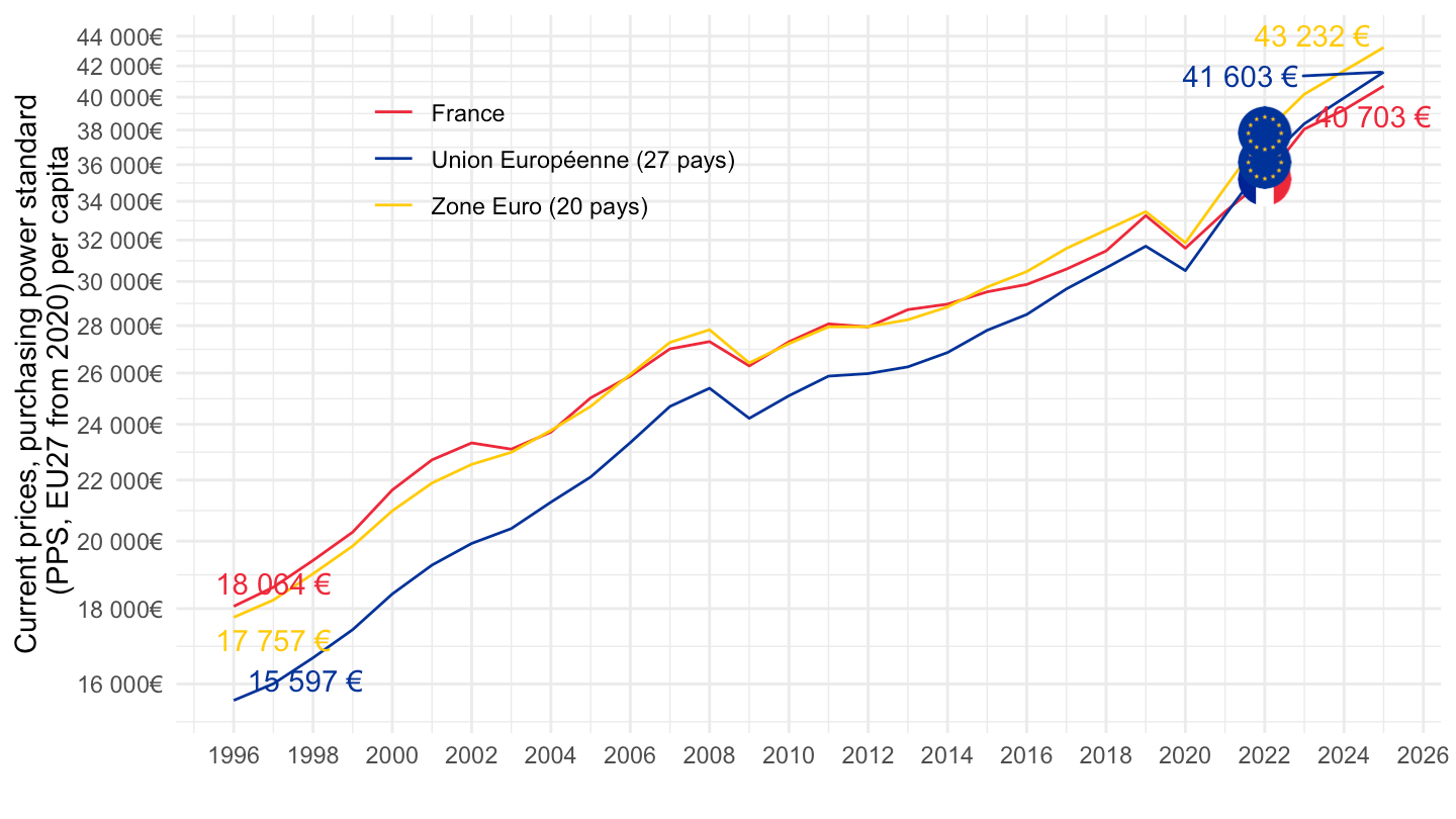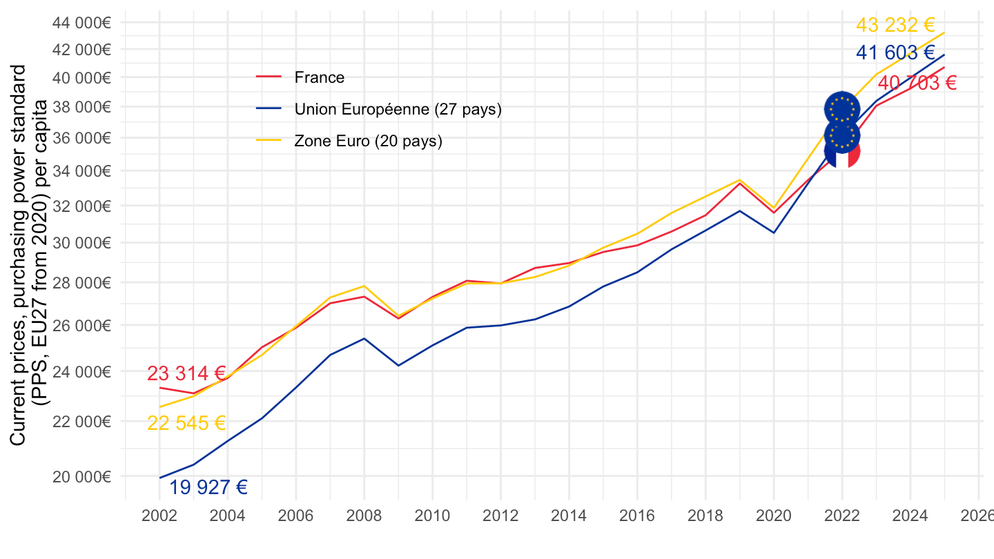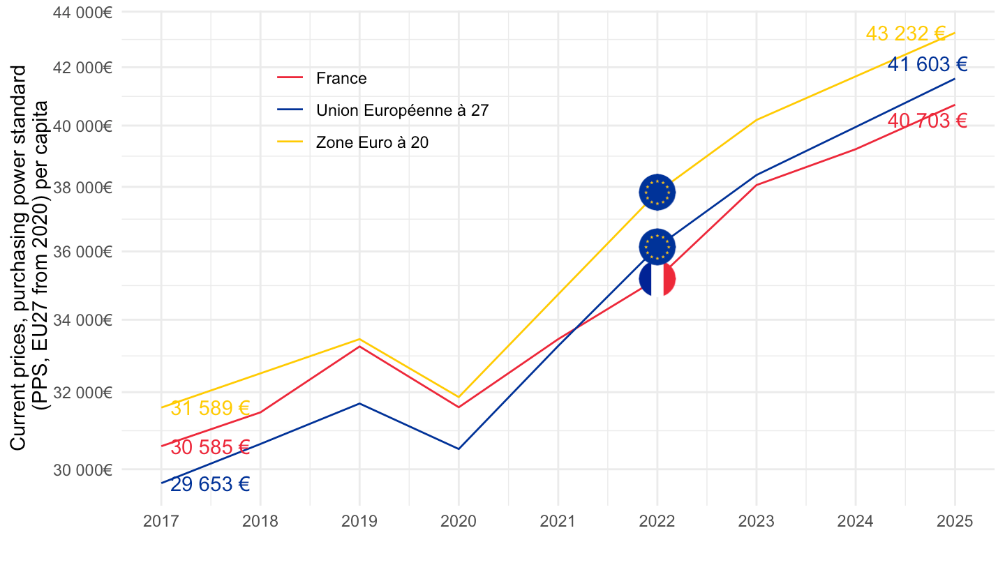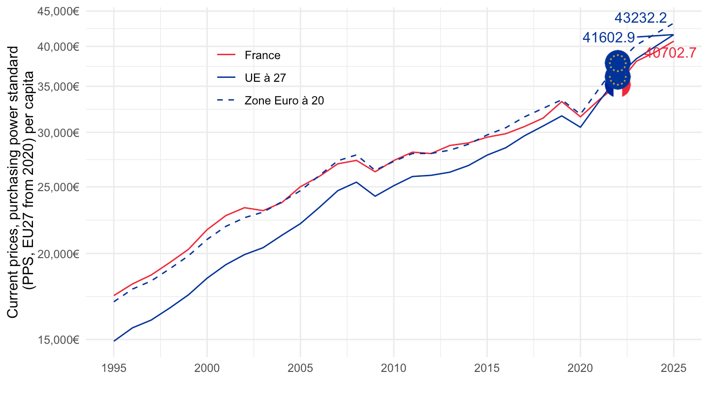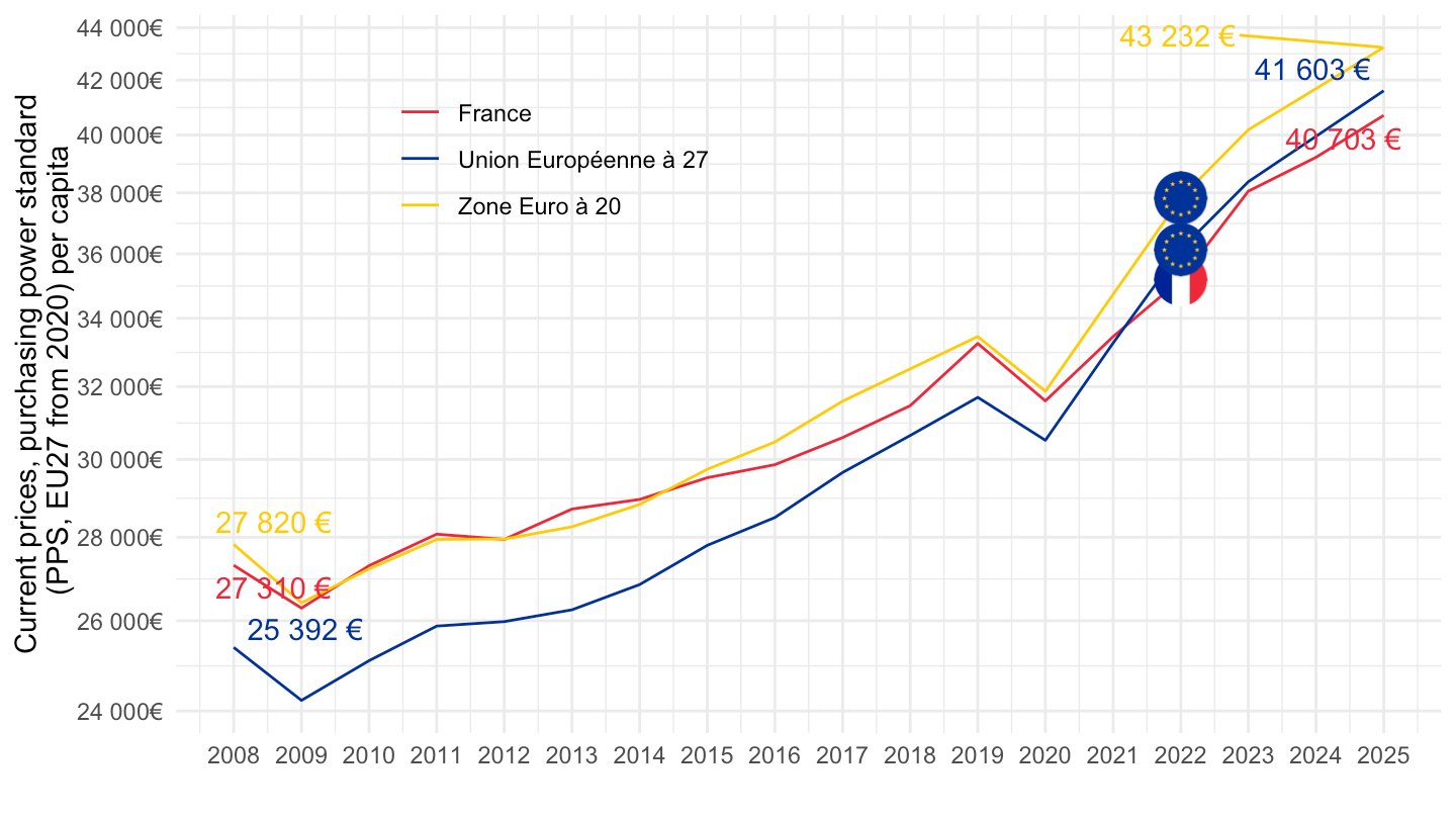 {if (is_html_output()) datatable(., filter = 'top', rownames = F) else .}GDP per capita: France vs EU27