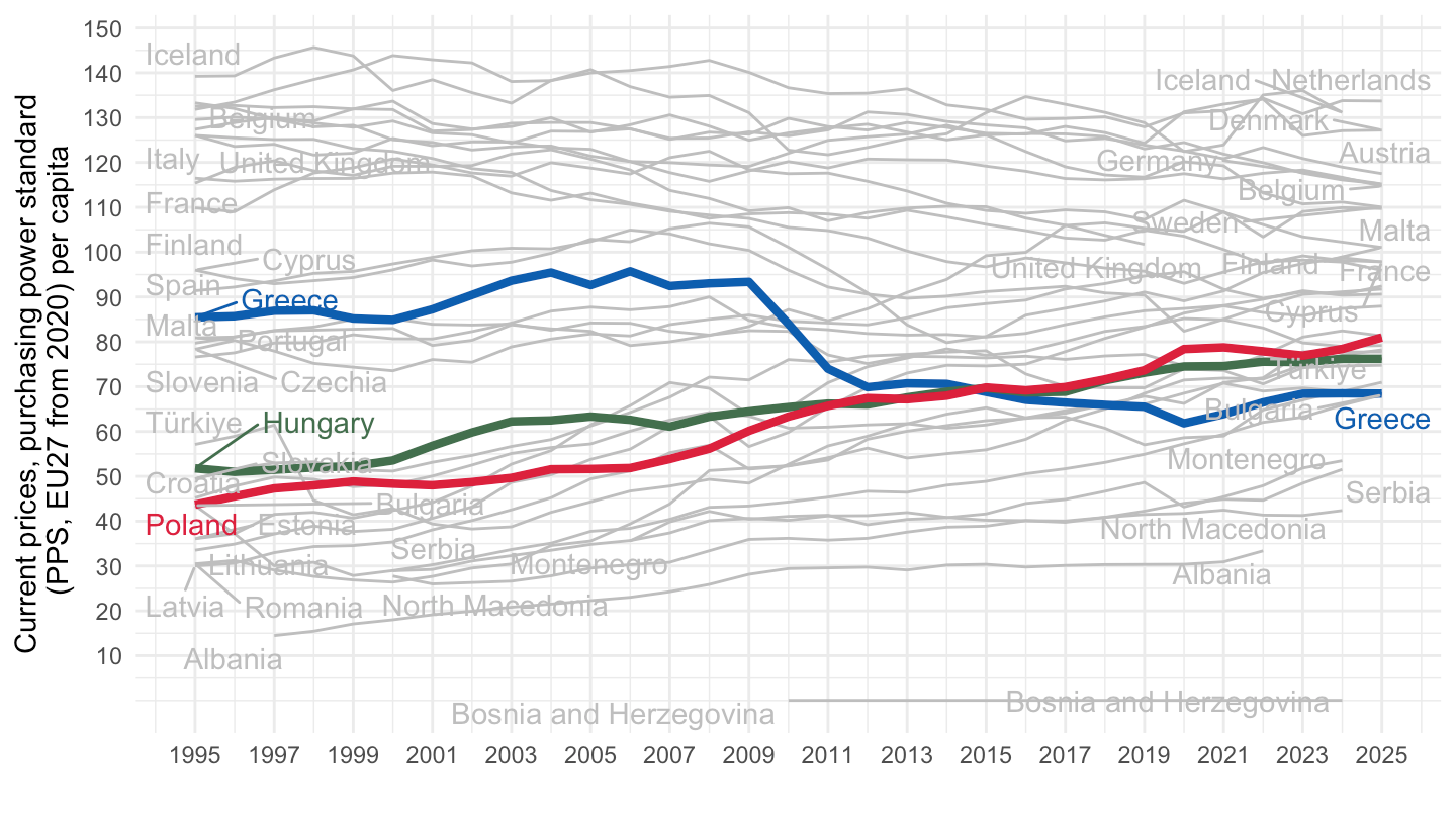 theme_minimal() + xlab("") + ylab("Current prices, purchasing power standard\n (PPS, EU27 from 2020) per capita") +