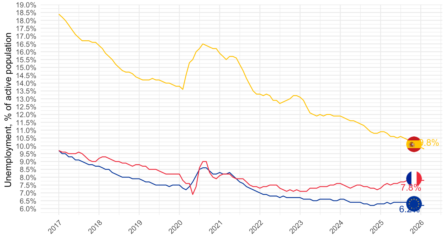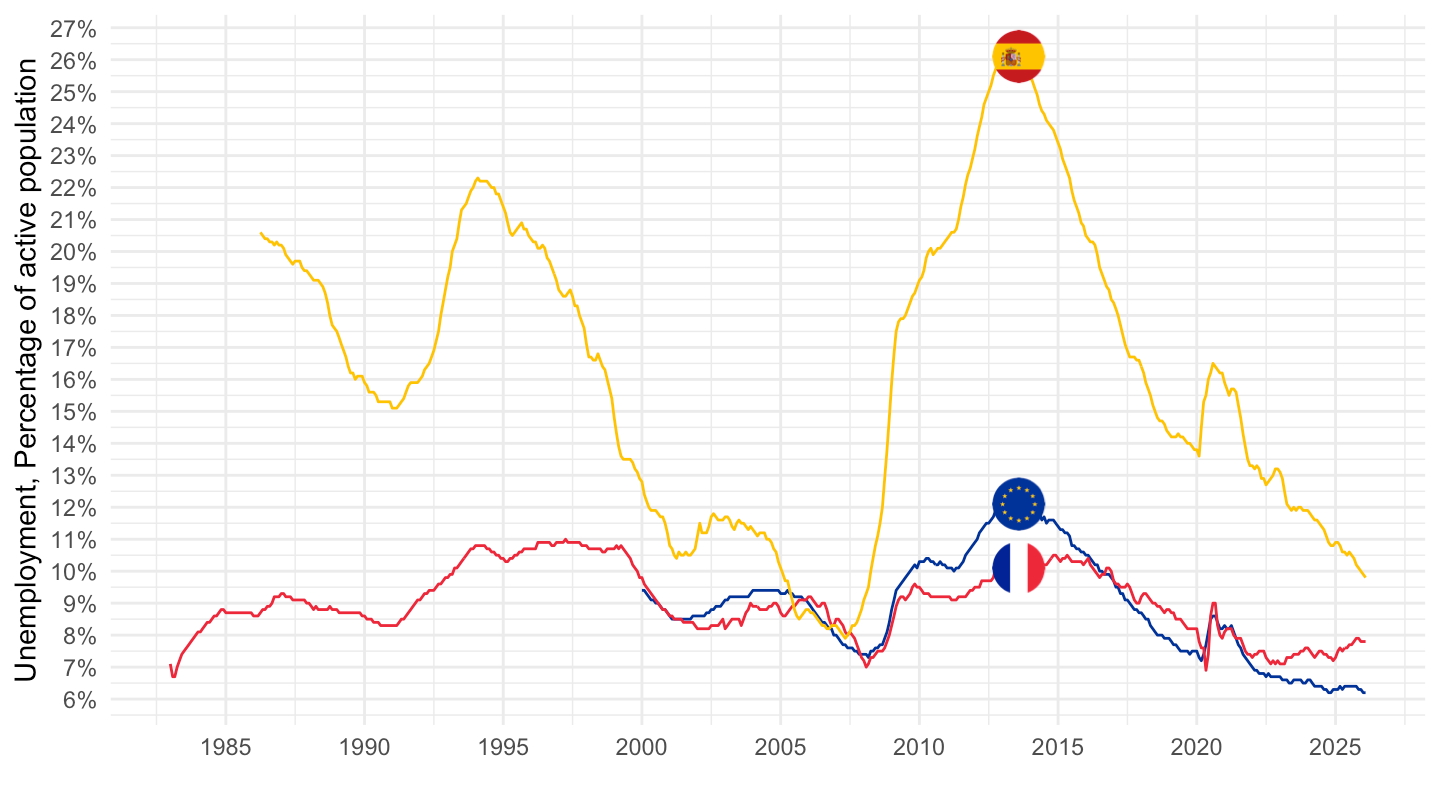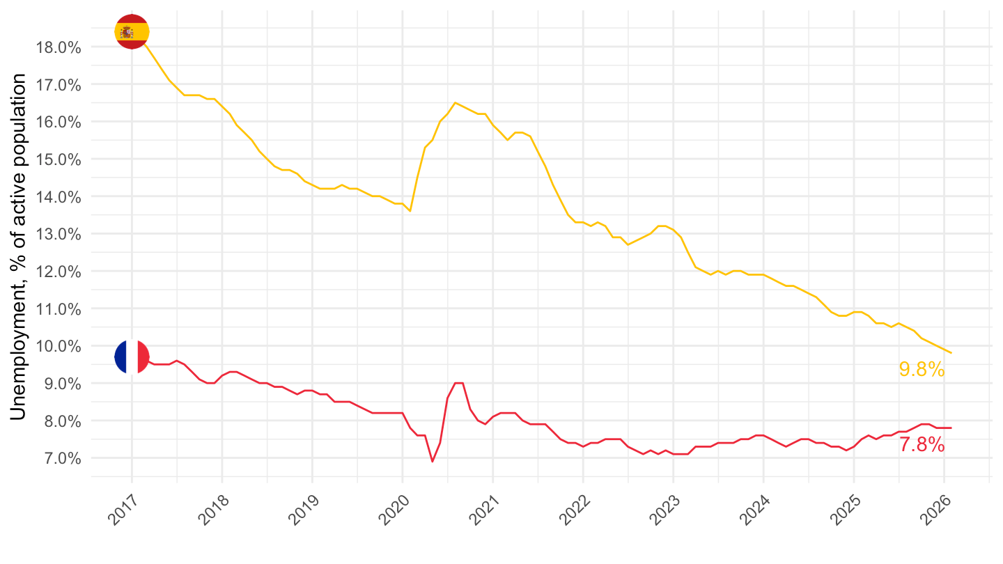xlab("") + ylab("Unemployment, % of active population") +