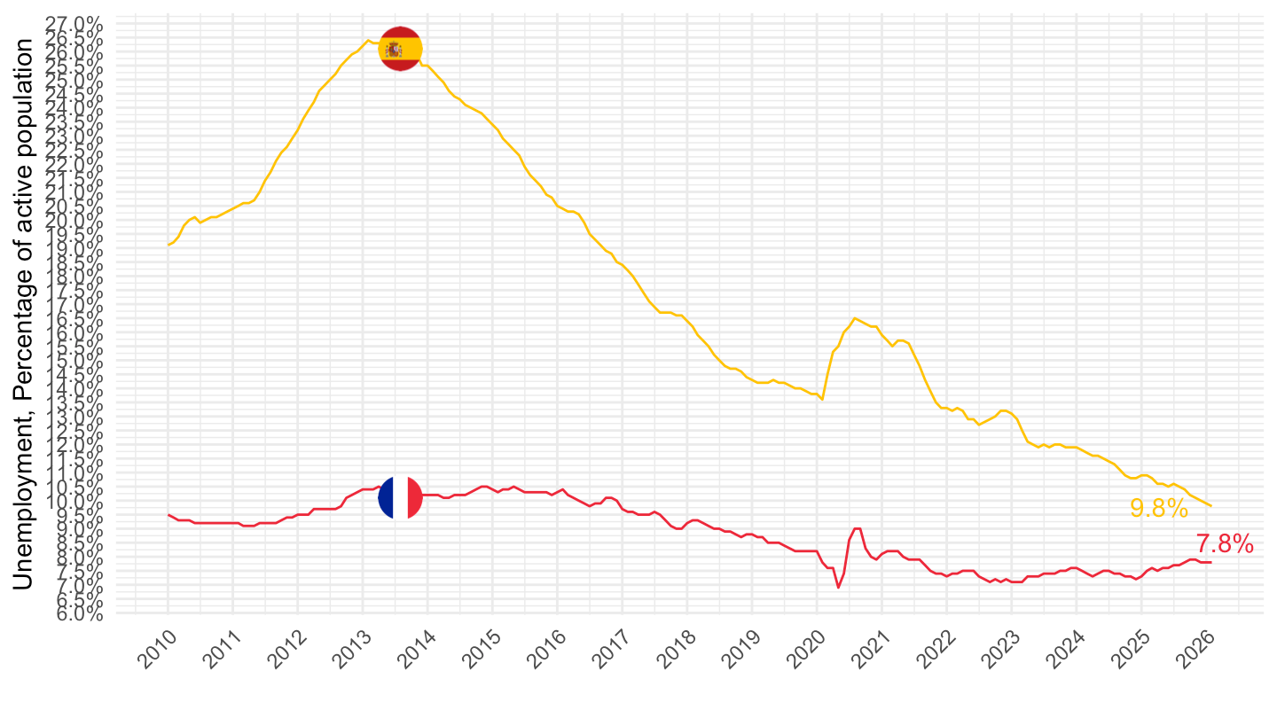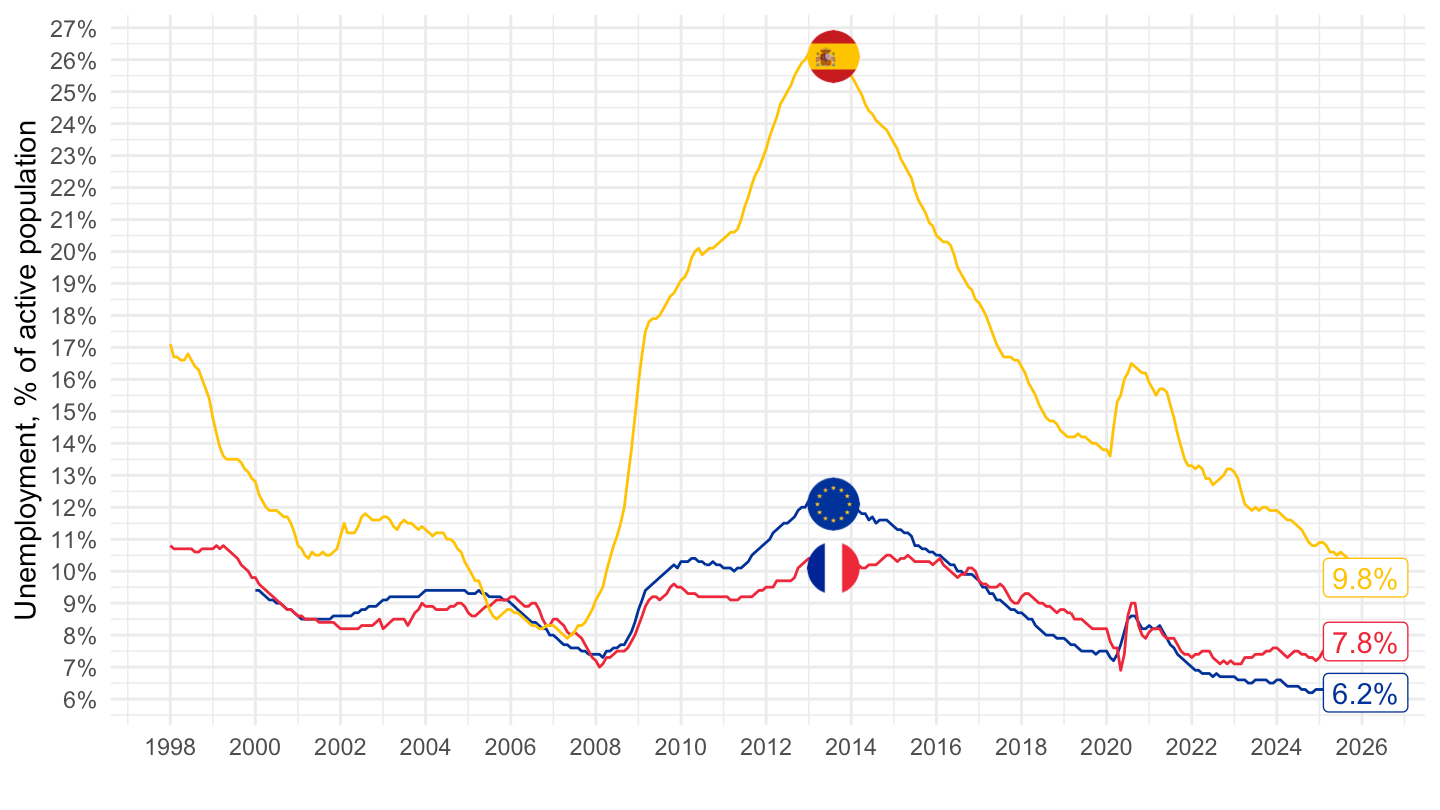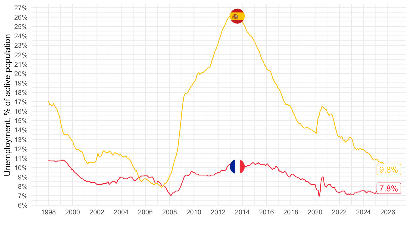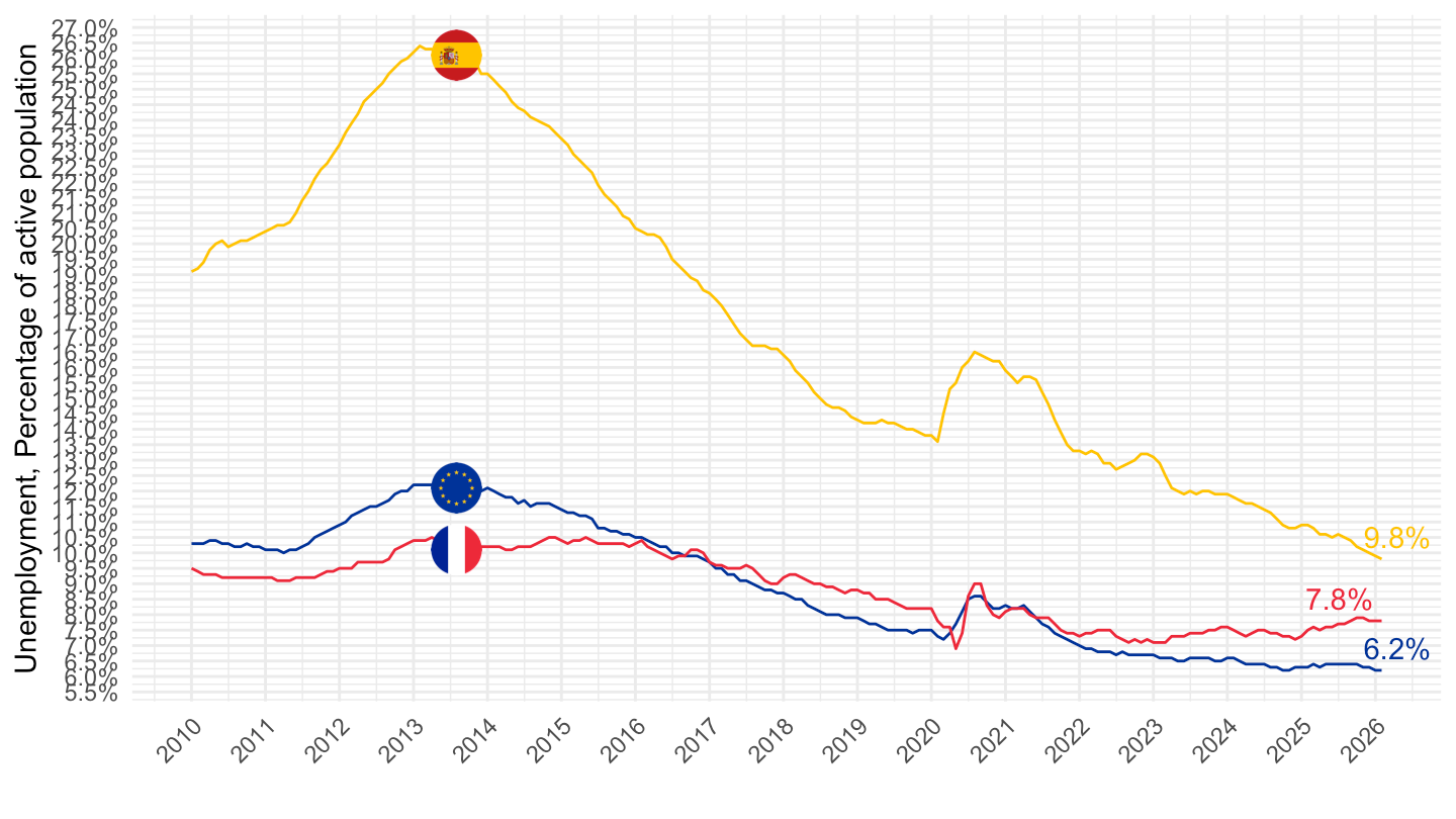 xlab("") + ylab("Unemployment, % of active population") +