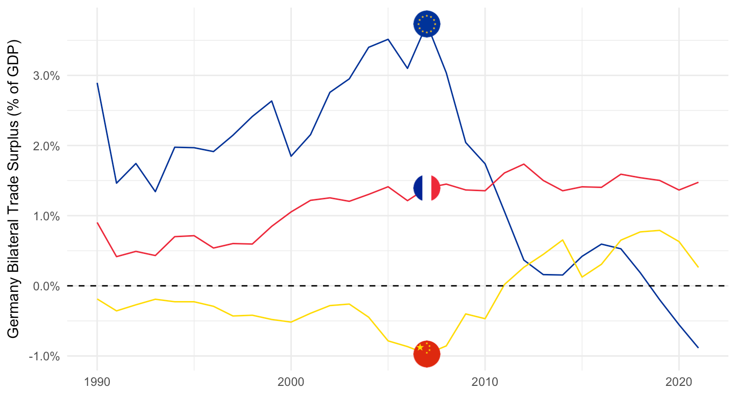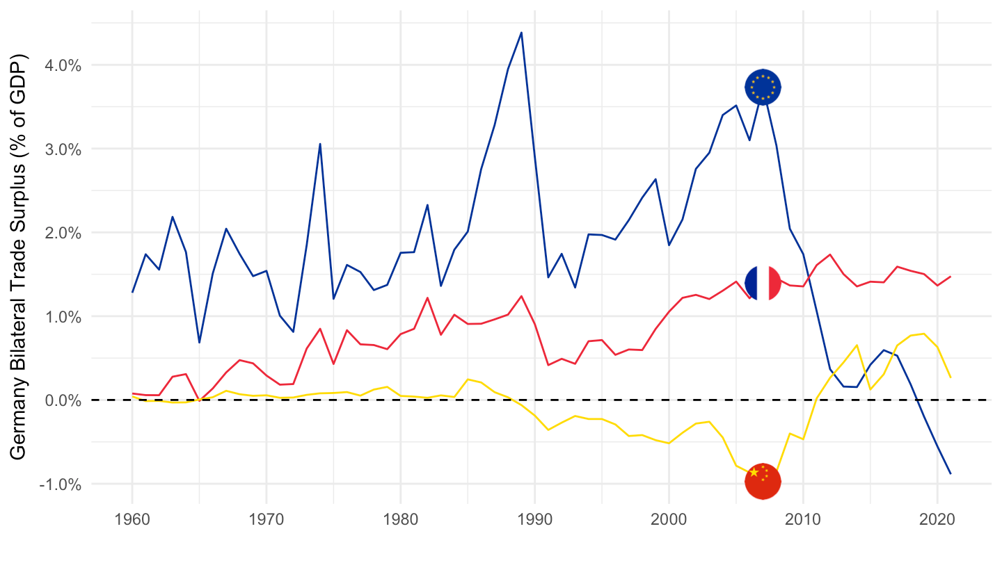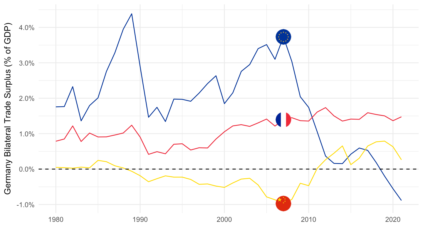 xlab("") + ylab("Germany Bilateral Trade Surplus (% of GDP)") +