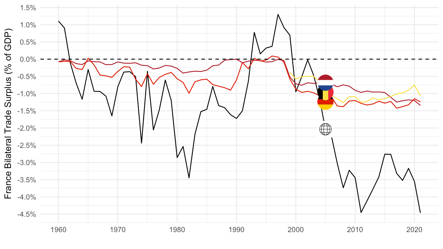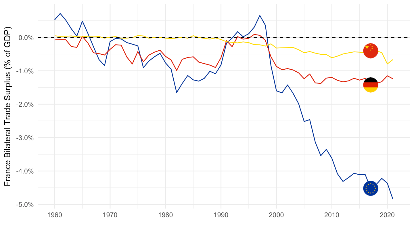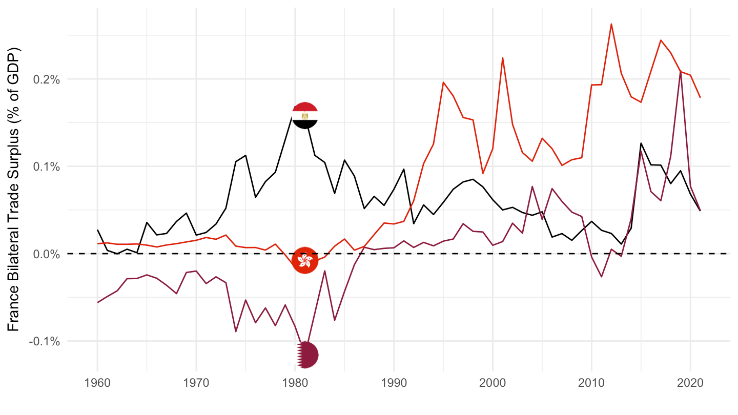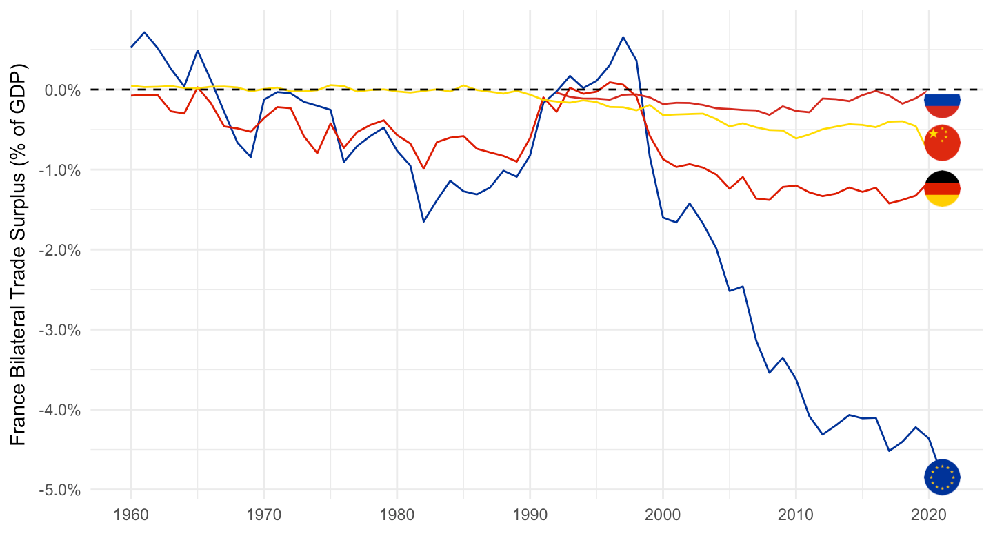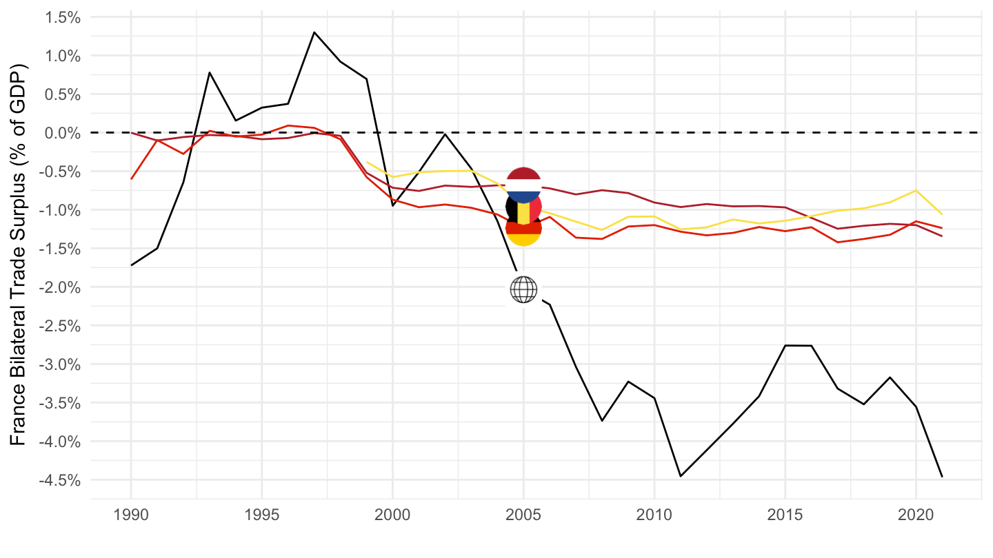 xlab("") + ylab("France Bilateral Trade Surplus (% of GDP)") +