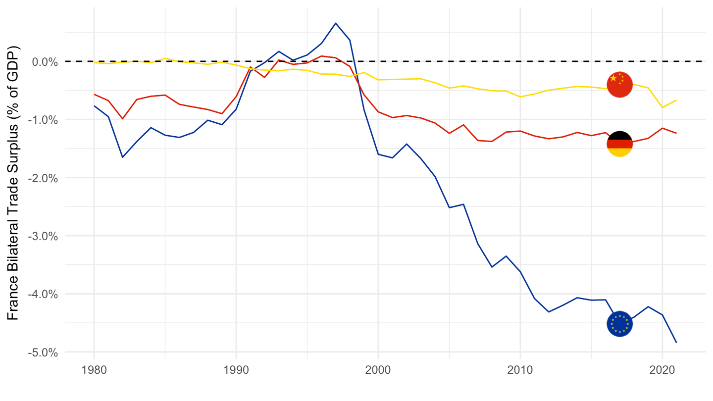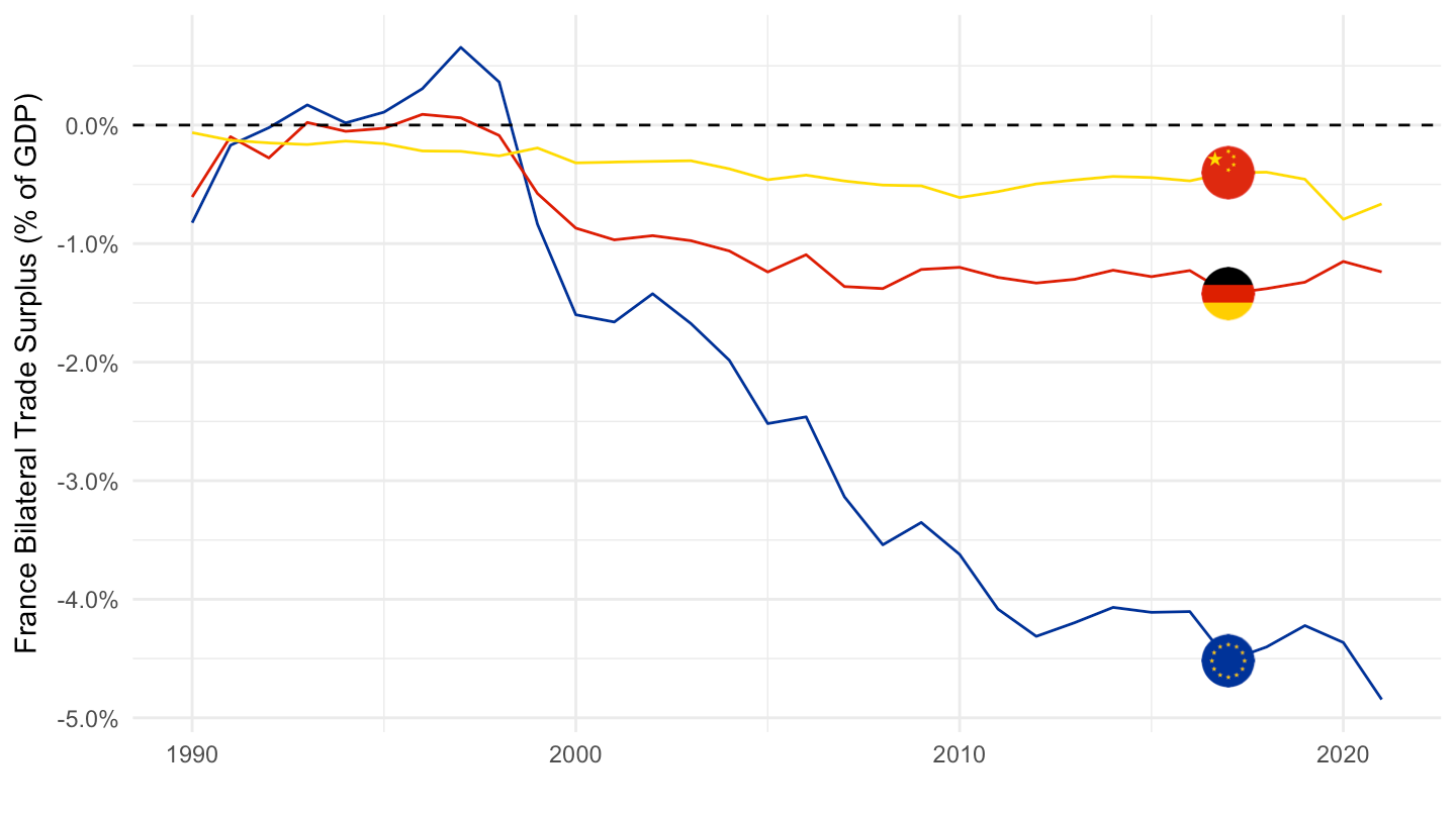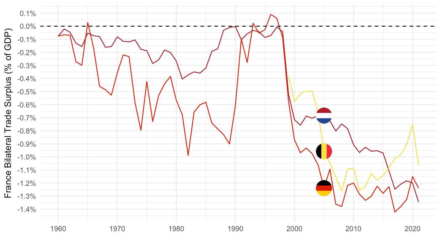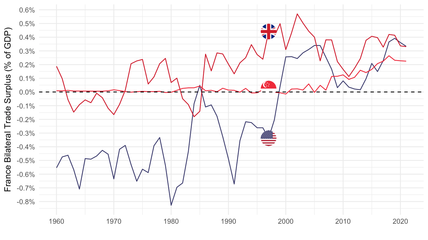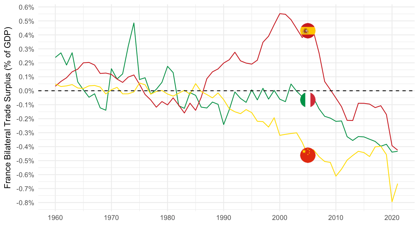 xlab("") + ylab("France Bilateral Trade Surplus (% of GDP)") +