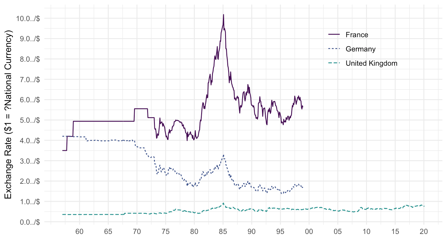 theme_minimal() + xlab("") + ylab("Exchange Rate ($1 = ?National Currency)") +