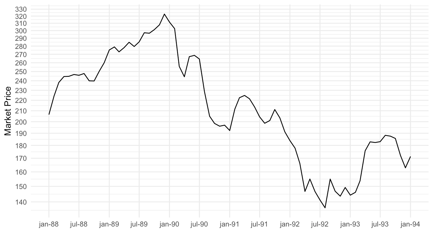 date ggplot() + theme_minimal() + xlab("") + ylab("Market Price") +