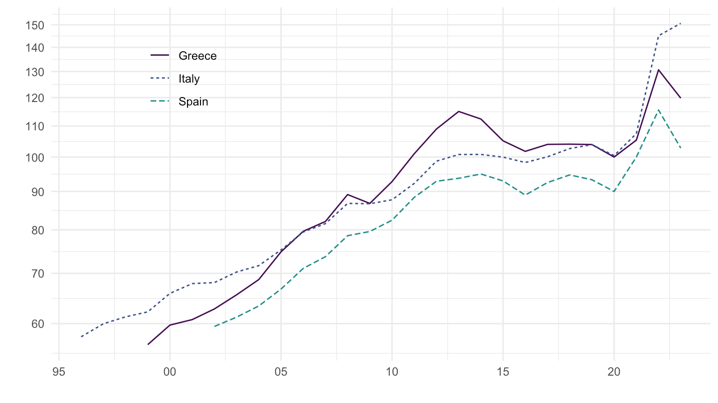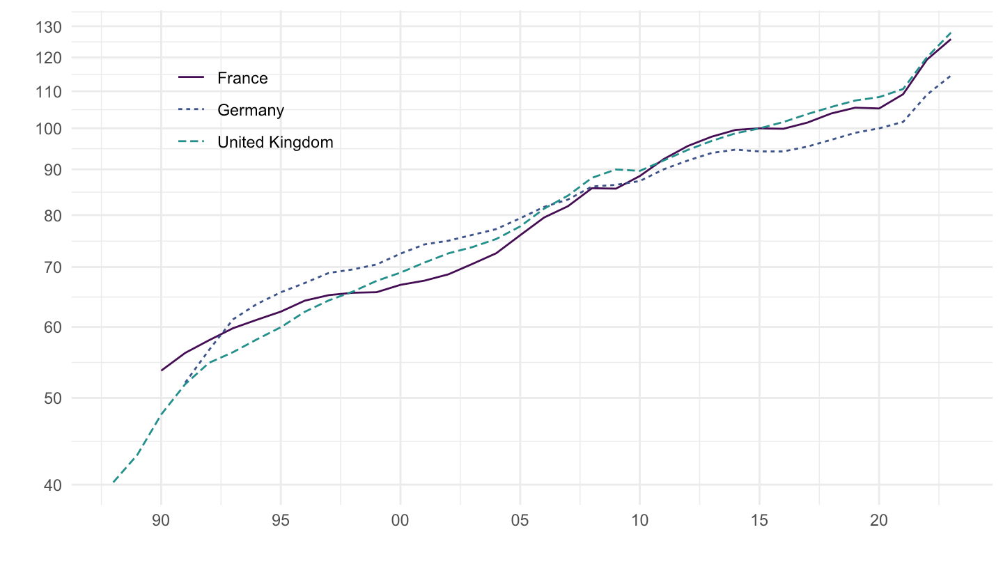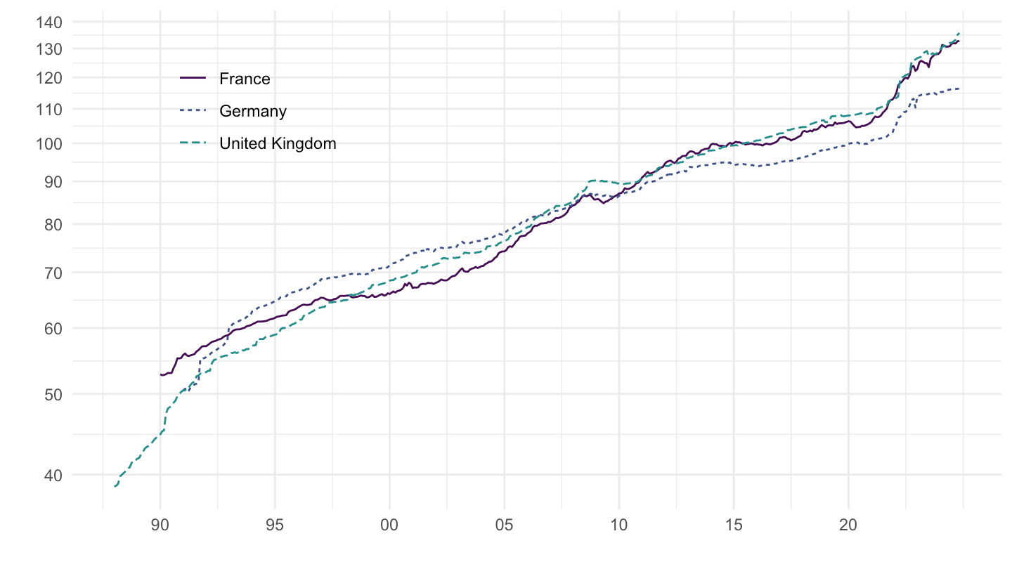 geom_line(aes(x = date, y = OBS_VALUE, color = Ref_area, linetype = Ref_area)) +