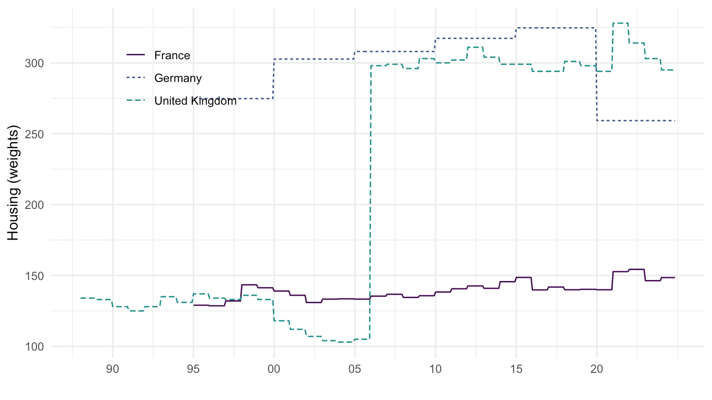 ggplot(.) + theme_minimal() + xlab("") + ylab("Housing (weights)") +
