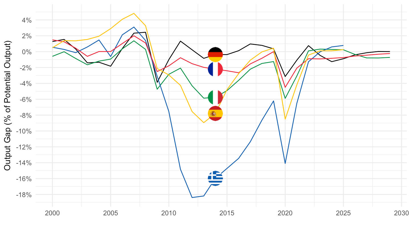 ylab("Output Gap (% of Potential Output)") + xlab("")