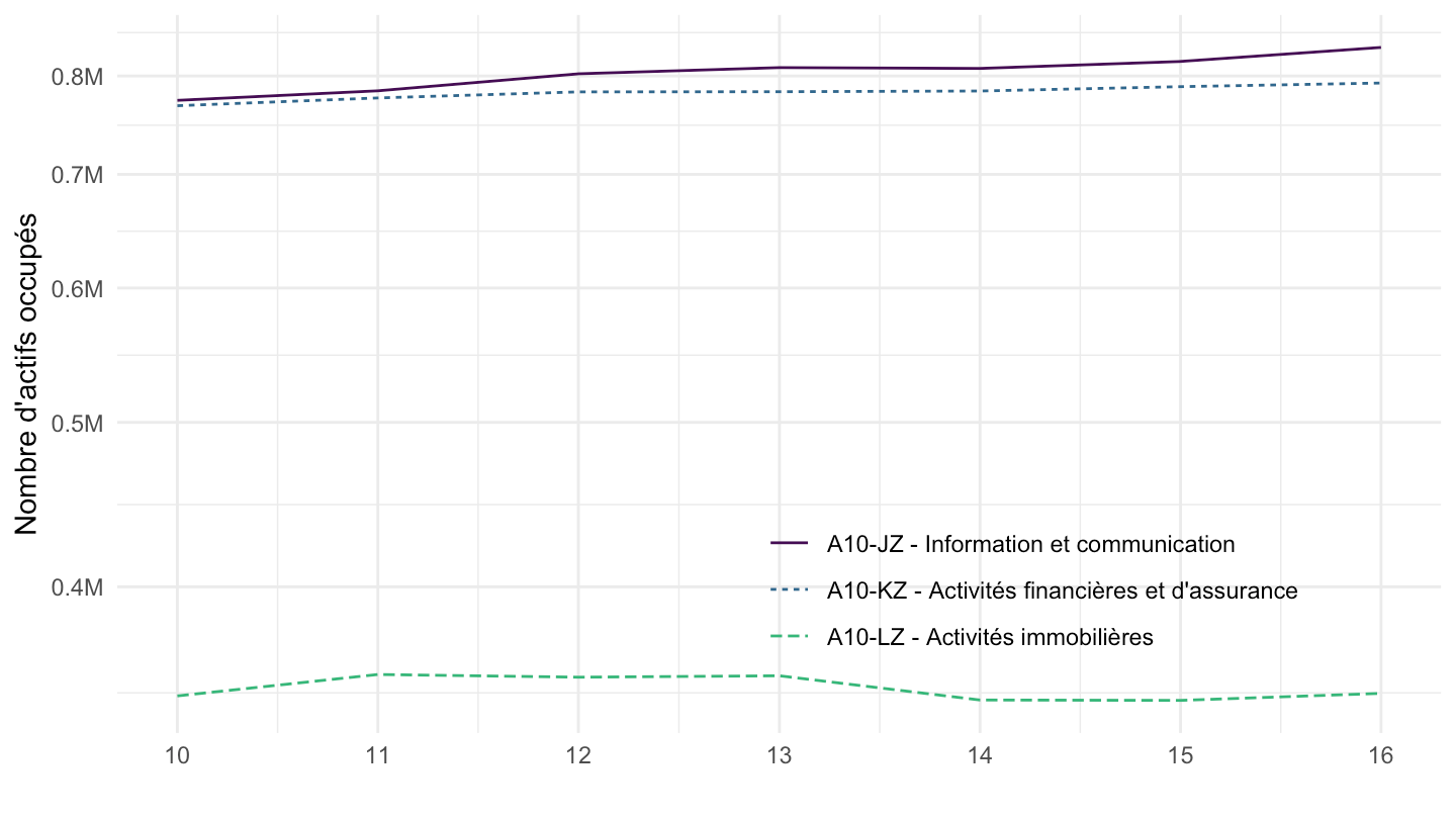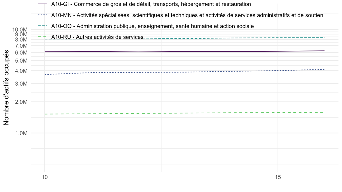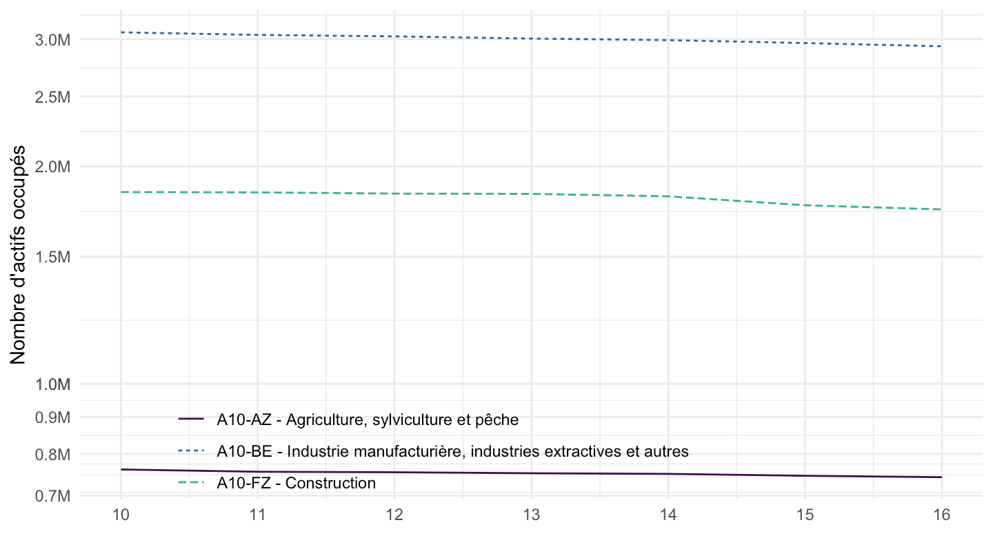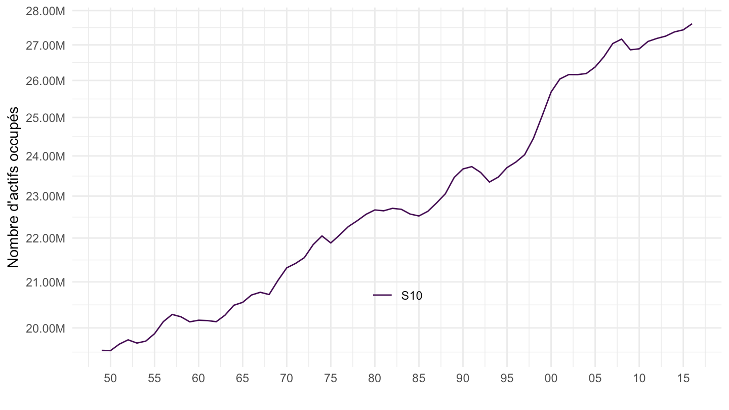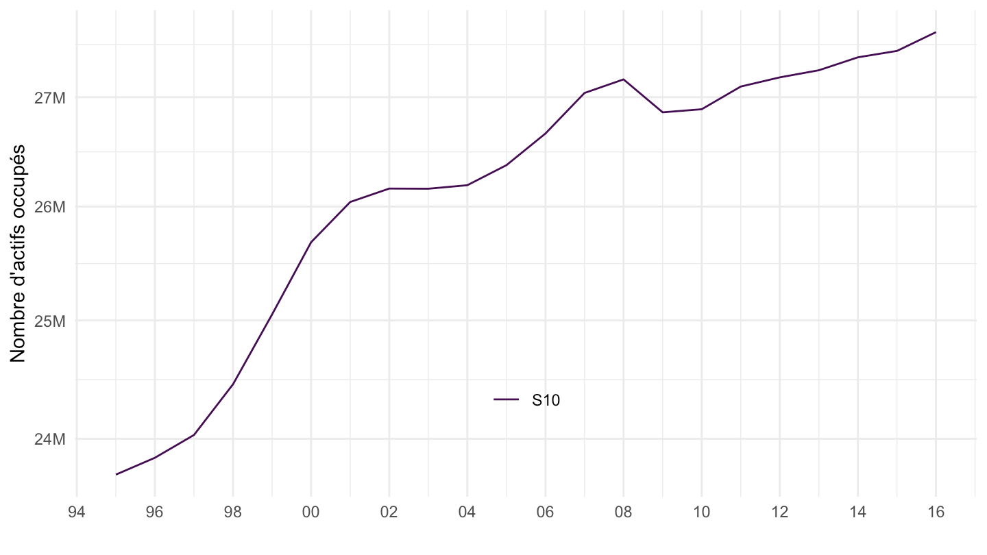ggplot() + theme_minimal() + ylab("Nombre d'actifs occupés") + xlab("") +