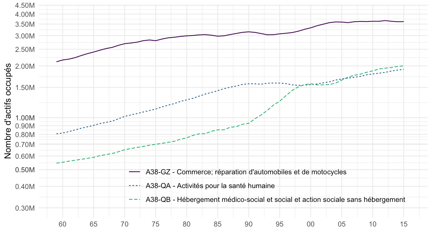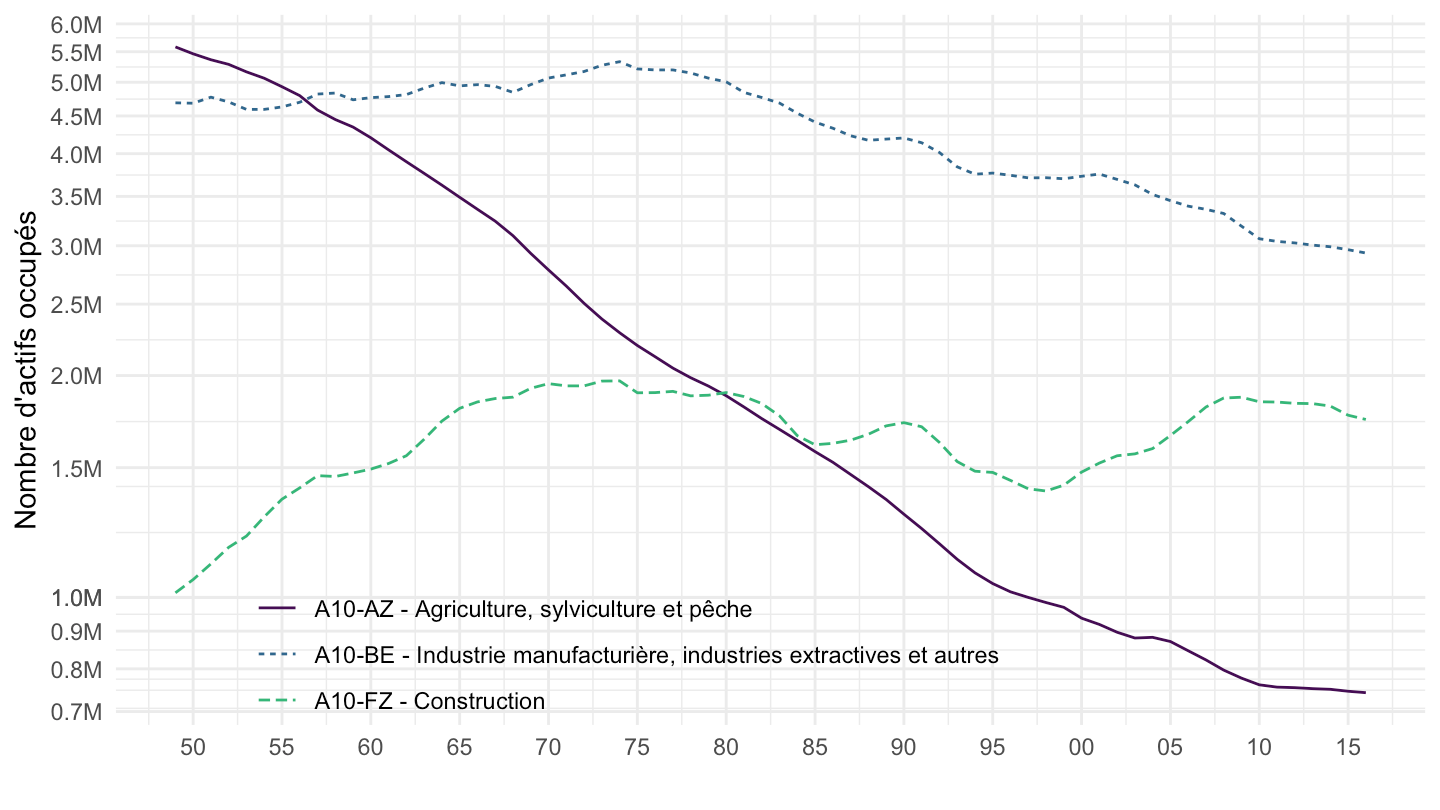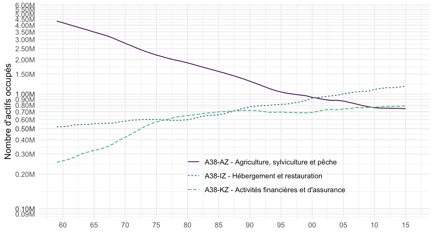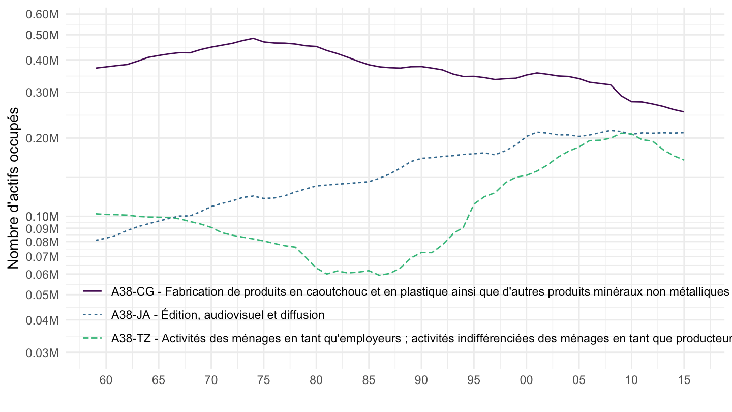 ggplot() + theme_minimal() + ylab("Nombre d'actifs occupés") + xlab("") +