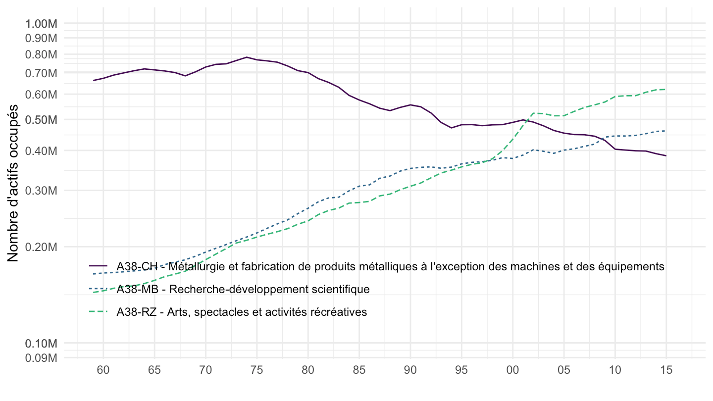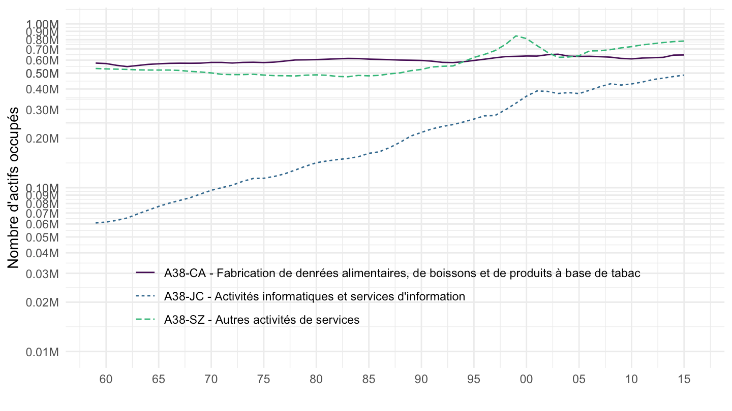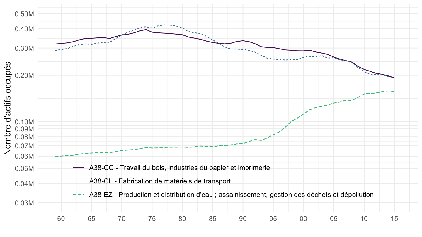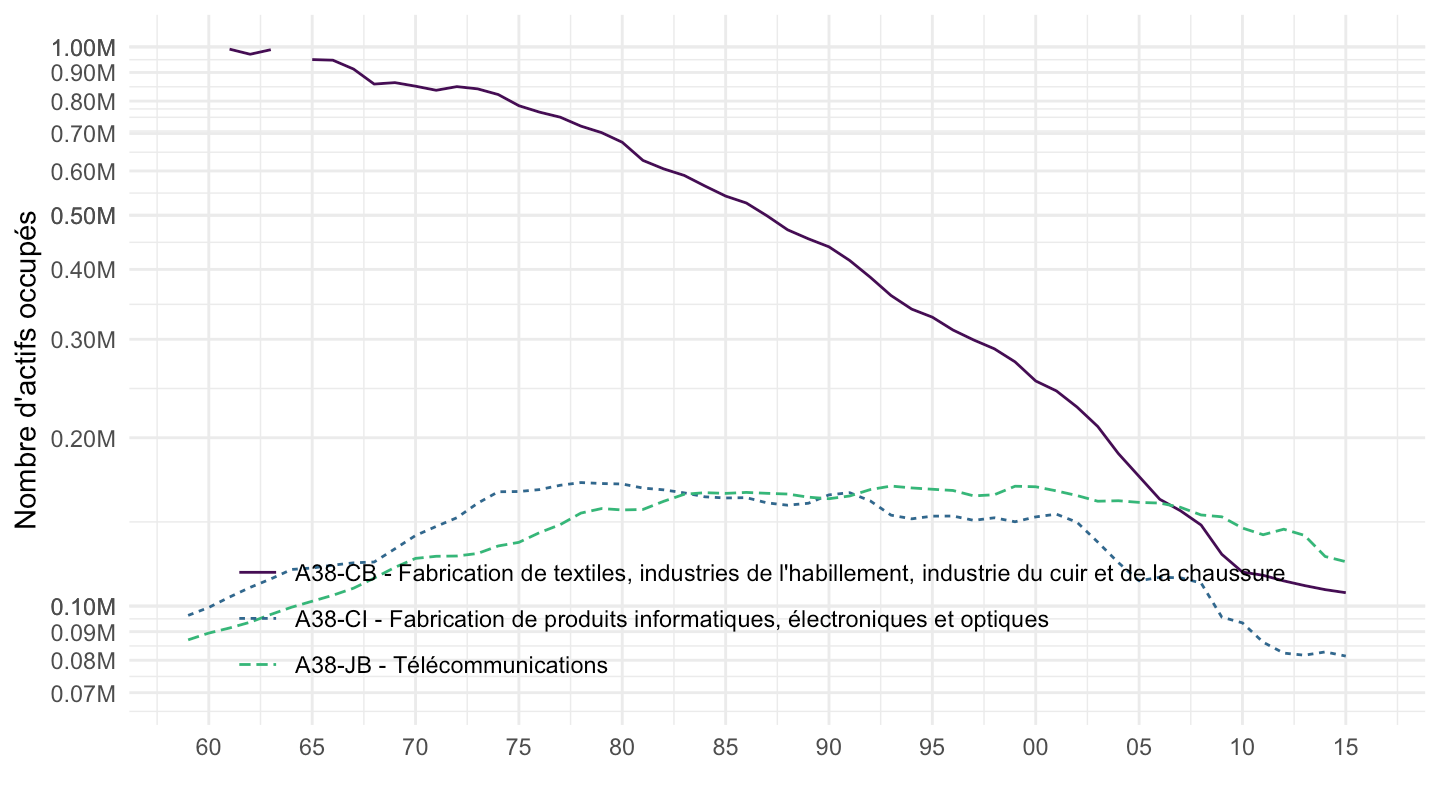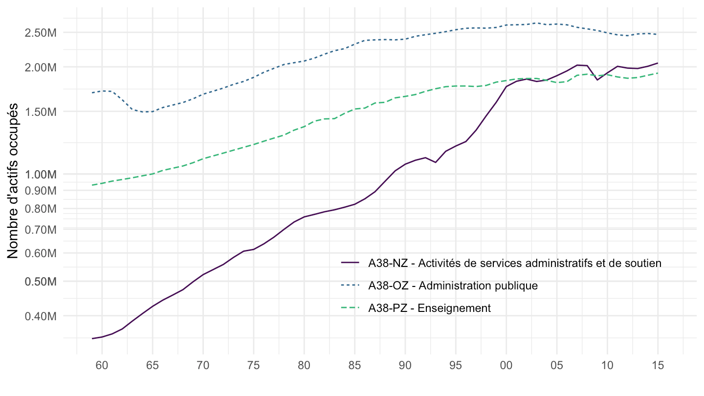 ggplot() + theme_minimal() + ylab("Nombre d'actifs occupés") + xlab("") +