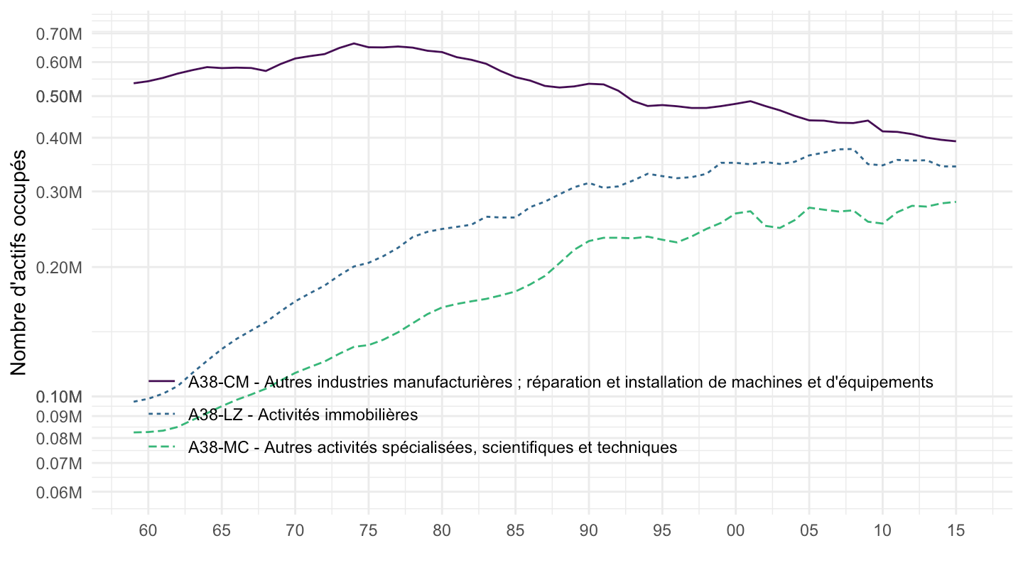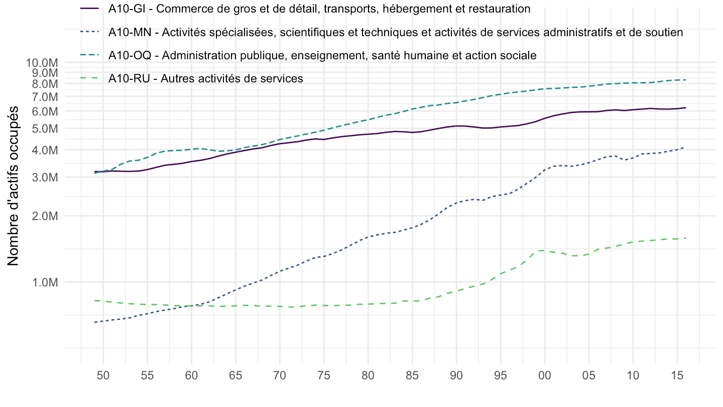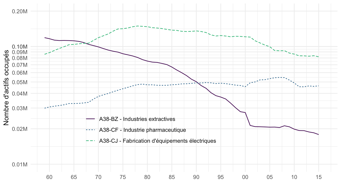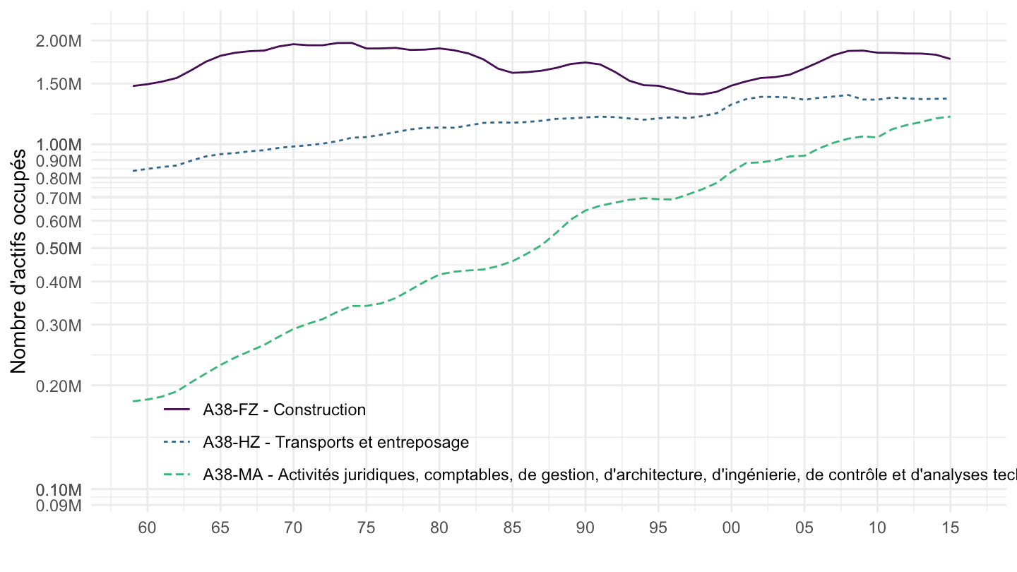 ggplot() + theme_minimal() + ylab("Nombre d'actifs occupés") + xlab("") +
