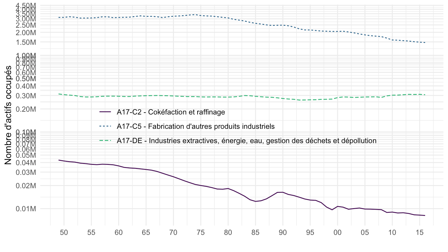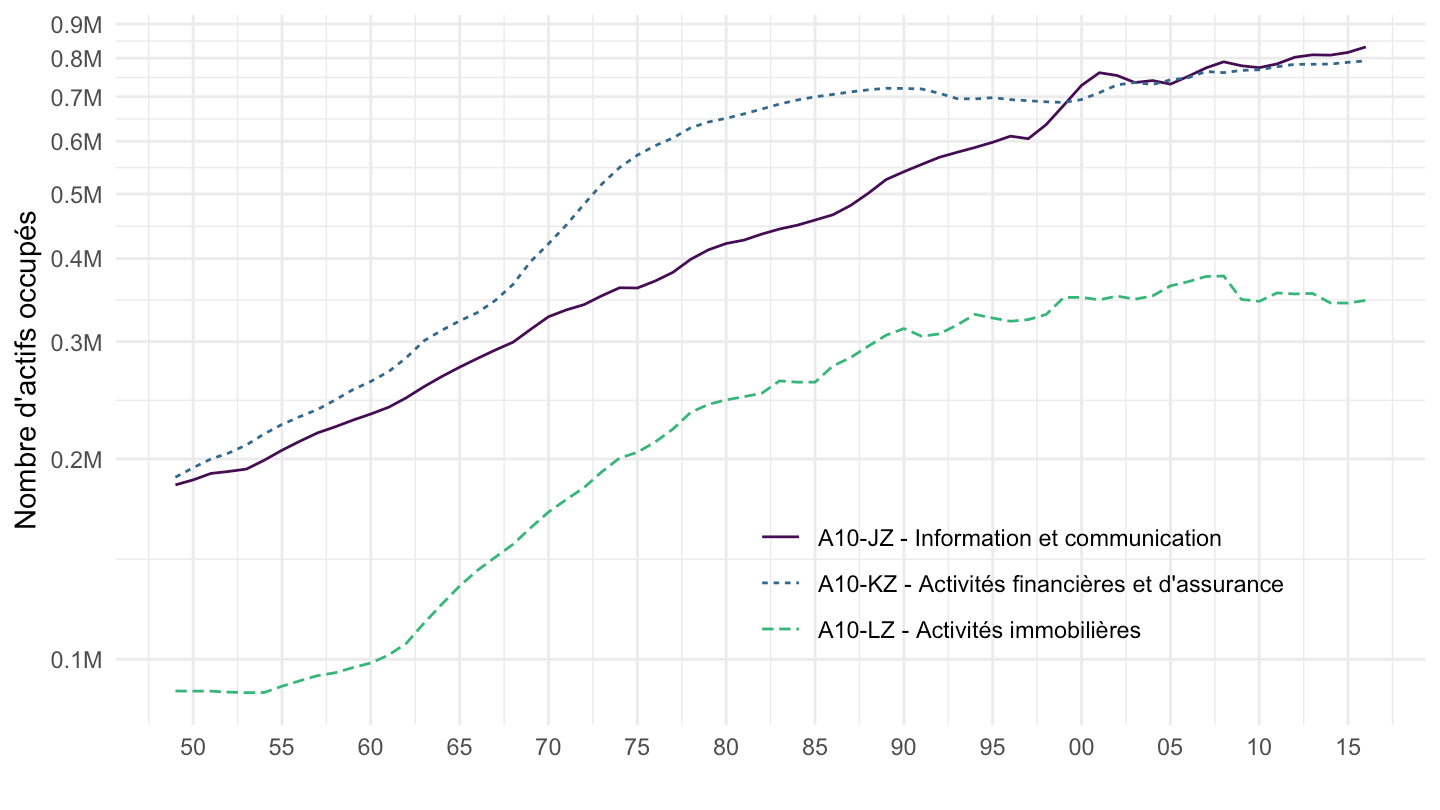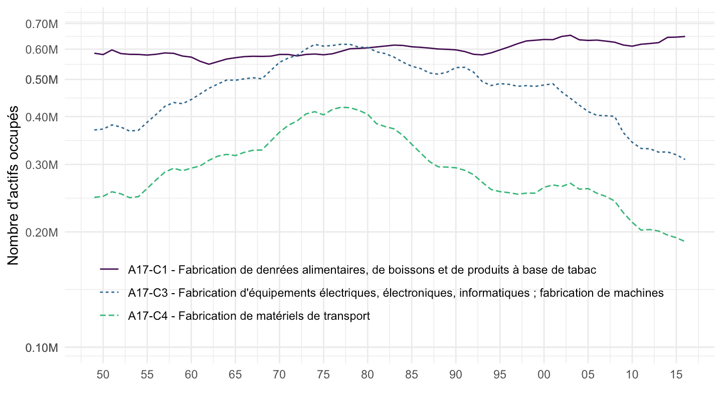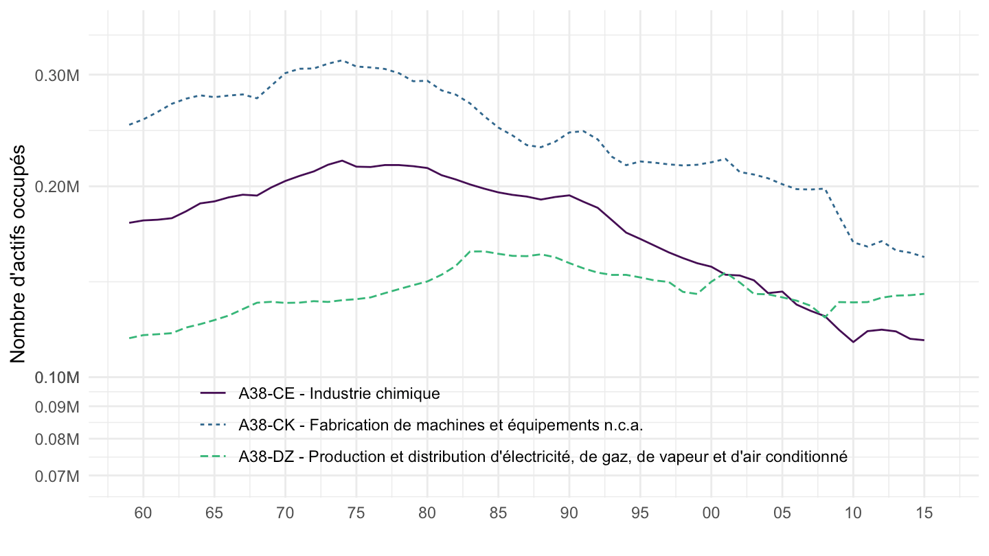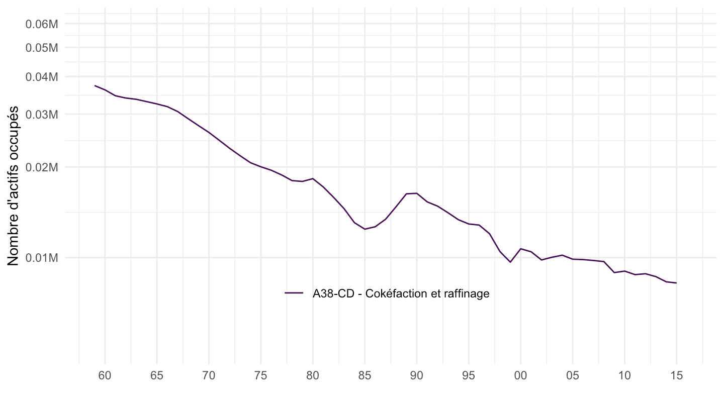 ggplot() + theme_minimal() + ylab("Nombre d'actifs occupés") + xlab("") +