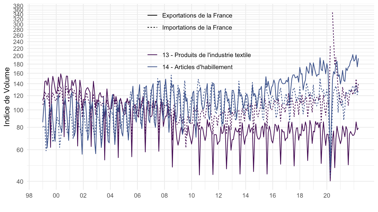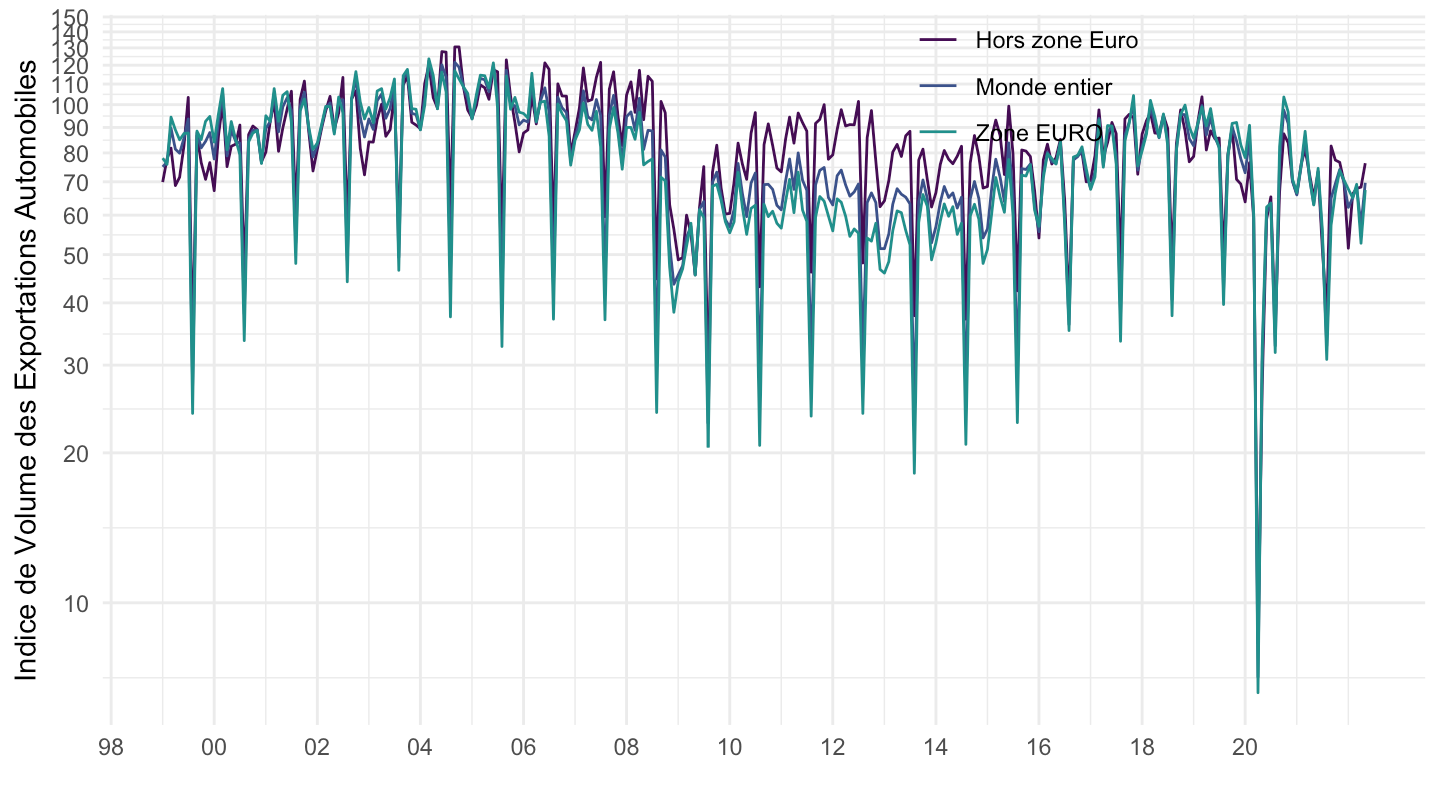 ggplot theme_minimal() + xlab("") + ylab("Indice de Volume des Exportations Automobiles") +