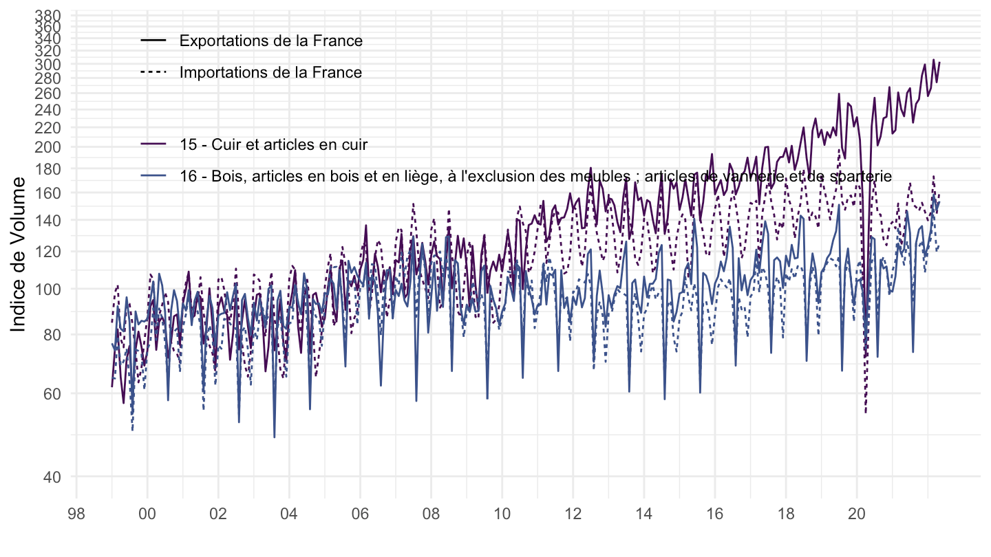 + geom_line(aes(x = date, y = OBS_VALUE, color = Com_ext_naf2, linetype = Indicateur)) +