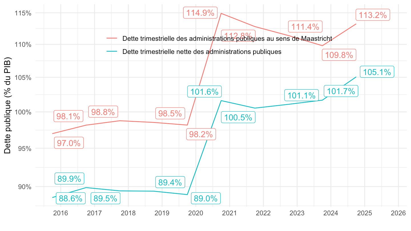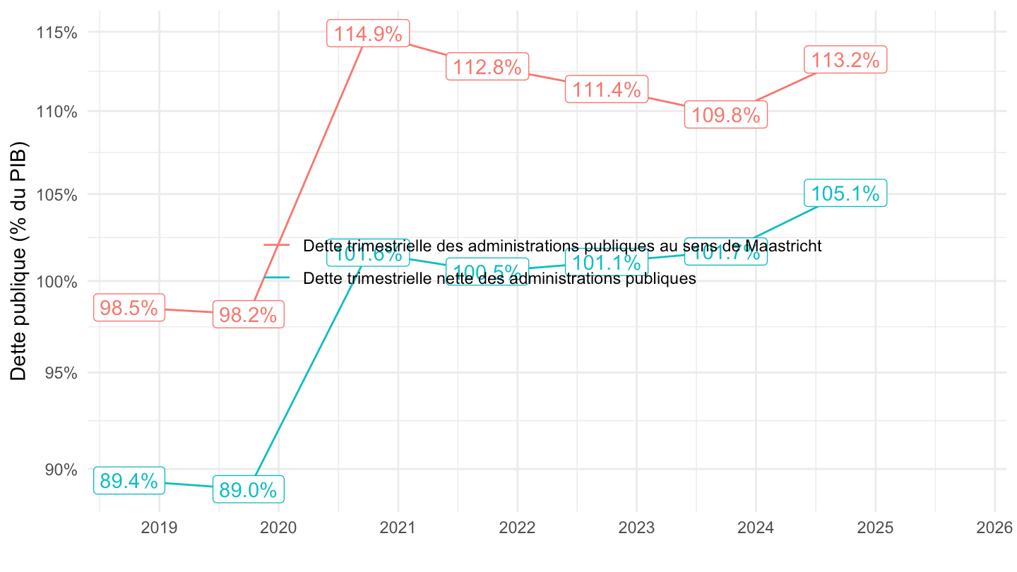 ggplot(.) + theme_minimal() + ylab("Dette publique (% du PIB)") + xlab("") +