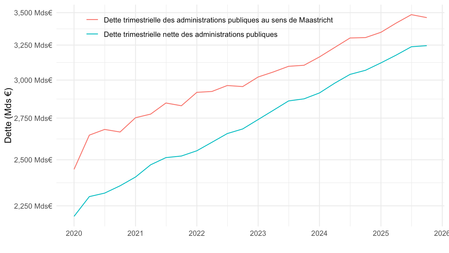 ggplot(.) + theme_minimal() + ylab("Dette (Mds €)") + xlab("") +