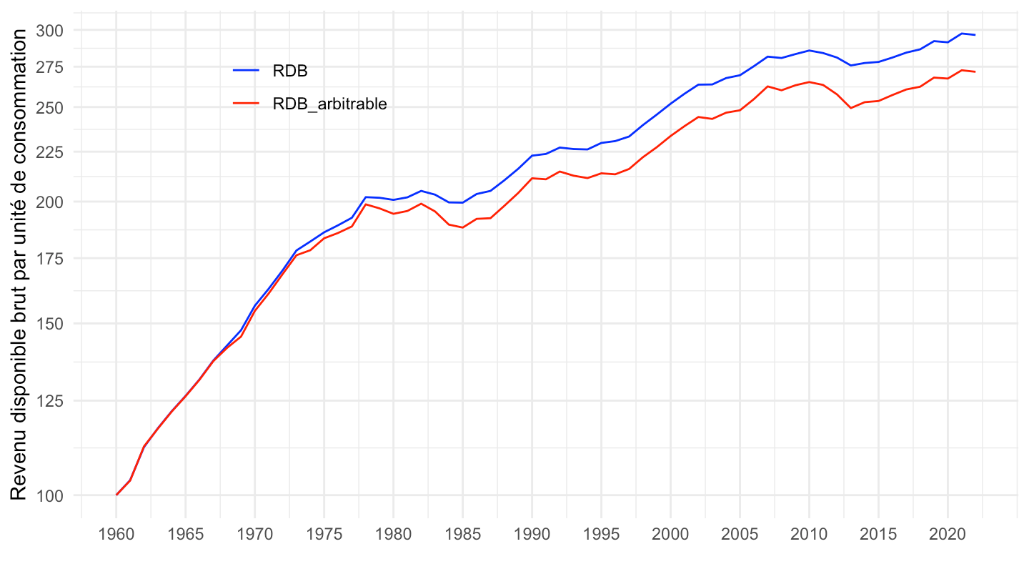 xlab("") + ylab("Revenu disponible brut par unité de consommation") +