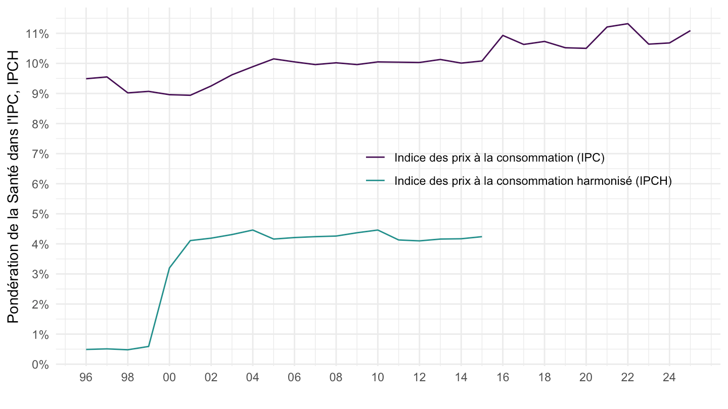ggplot() + ylab("Pondération de la Santé dans l'IPC, IPCH") + xlab("") + theme_minimal() +