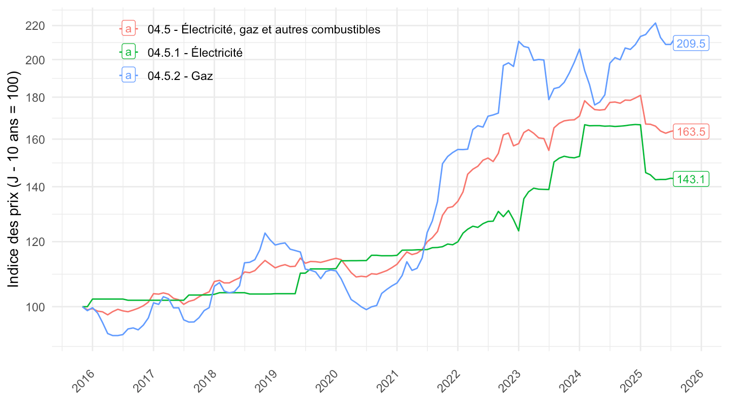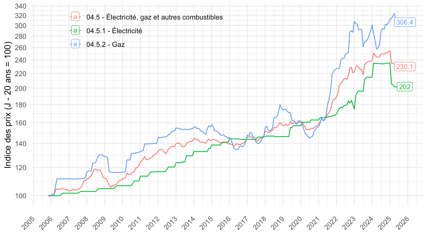 ggplot() + ylab("Indice des prix, Logement") + xlab("") + theme_minimal() +