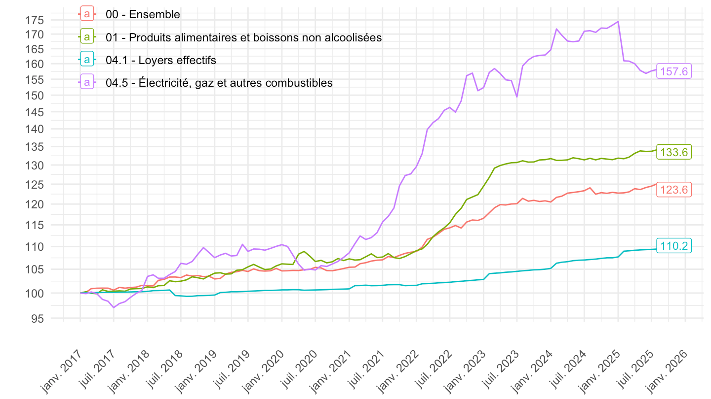 geom_label(data = . %>% filter(date == max(date)), aes(x = date, y = OBS_VALUE, color = Indicateur, label = round(OBS_VALUE, 1)))